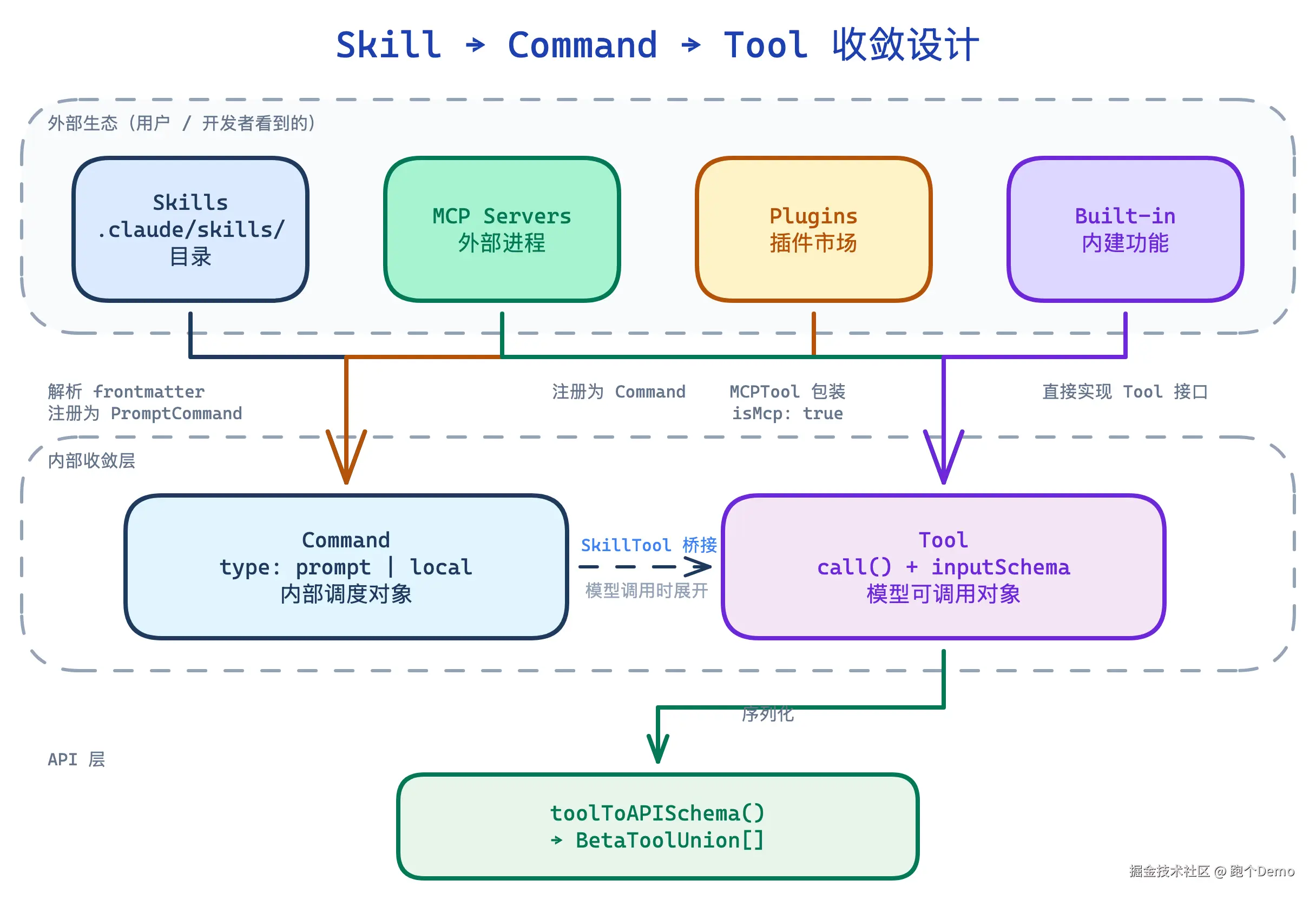 | 外部热闹内部收敛 | 内部只有 Command 和 Tool 两种对象 | 第 7 章:Skill→Command→Tool 收敛设计 |