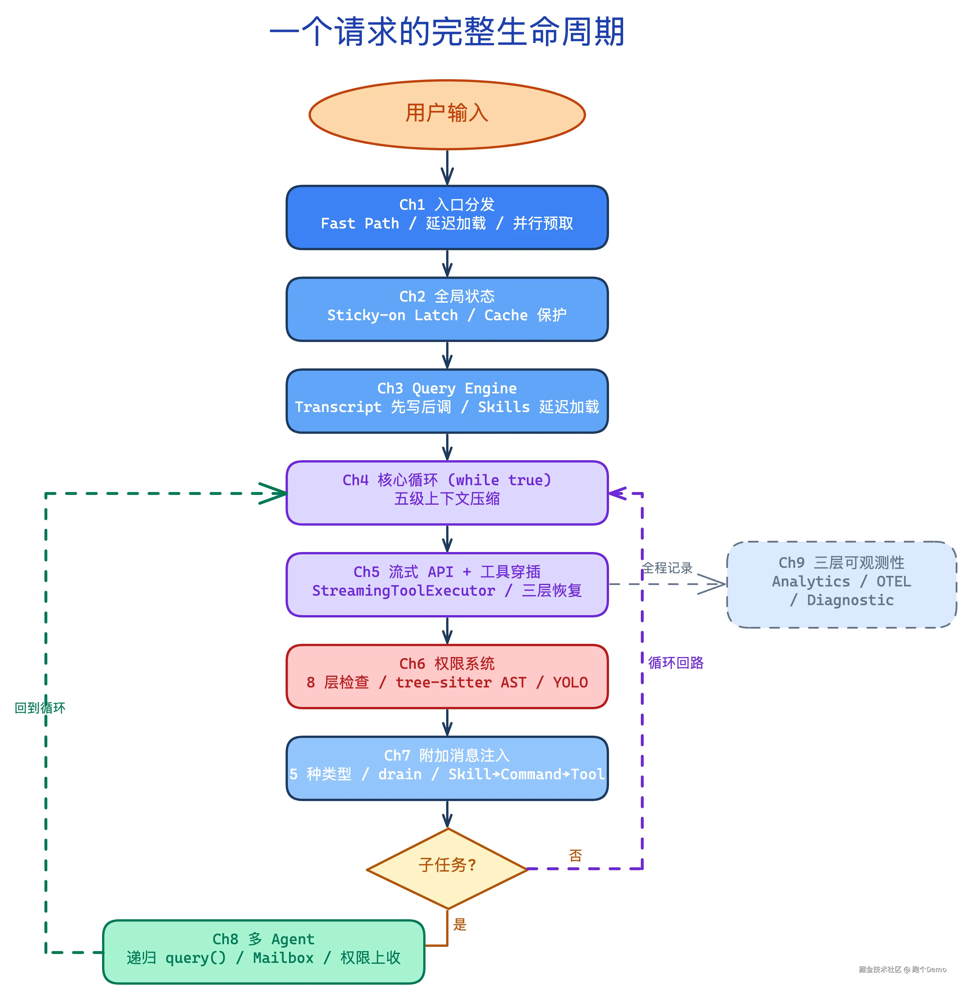 | 分层可观测 | 三套独立系统 | 第 9 章:Analytics / OTEL / Diagnostic |