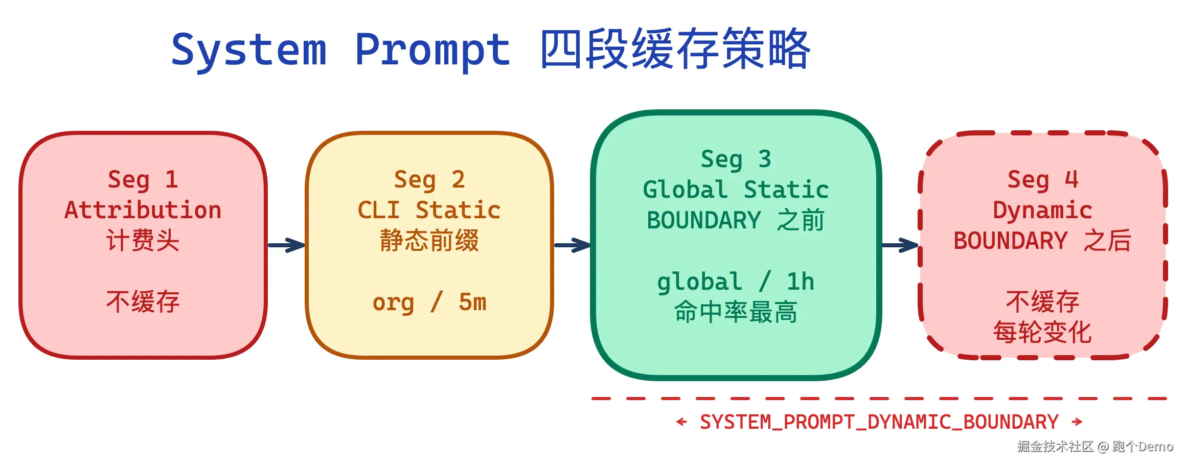 | Seg 4 | 动态内容(DYNAMIC_BOUNDARY 之后) | null(不缓存) | --- | 每轮变化的部分 |