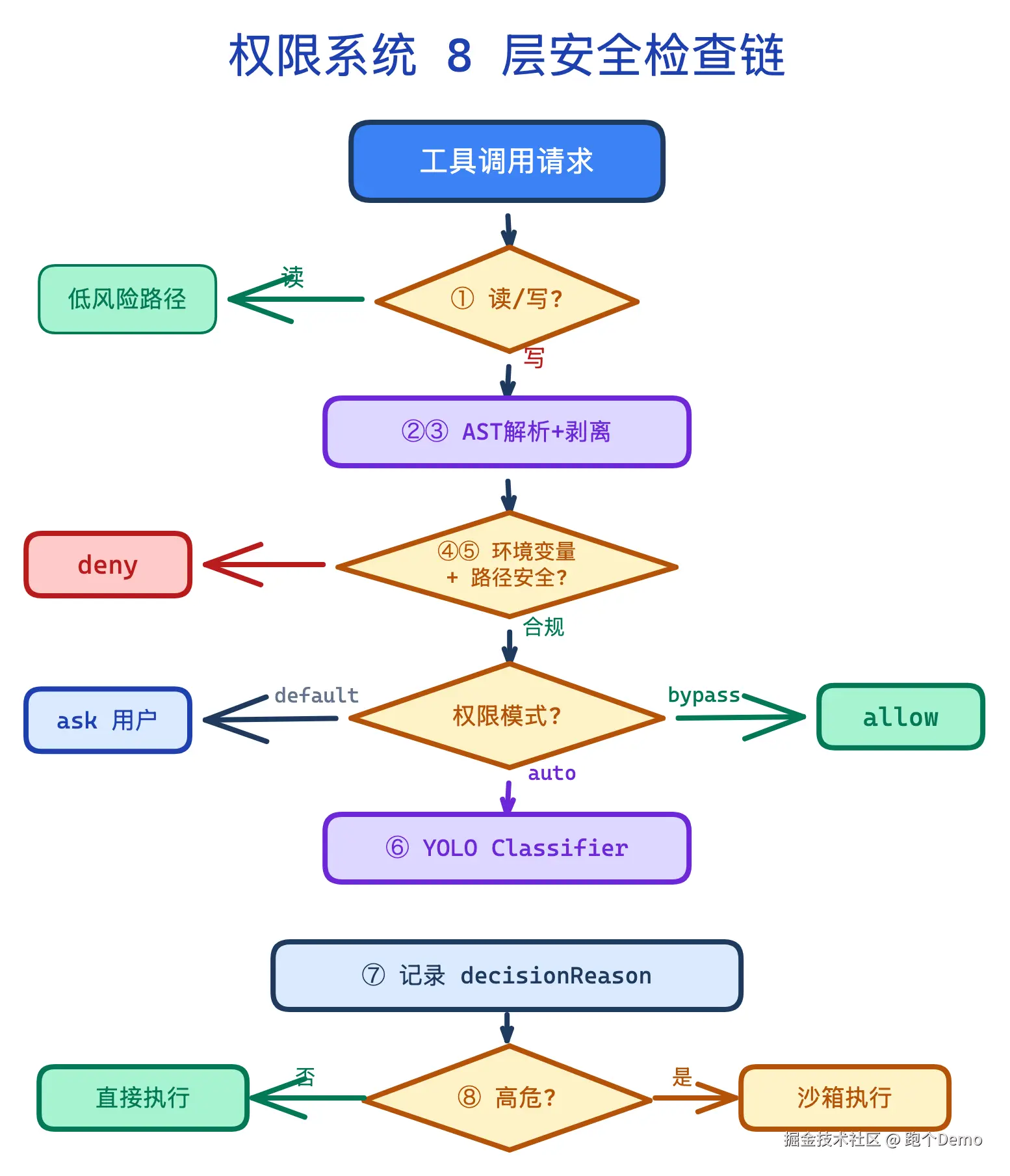 | 权限可解释 | 不是弹框,是 8 层执行链 | 第 6 章:tree-sitter AST、包装器剥离、decisionReason |