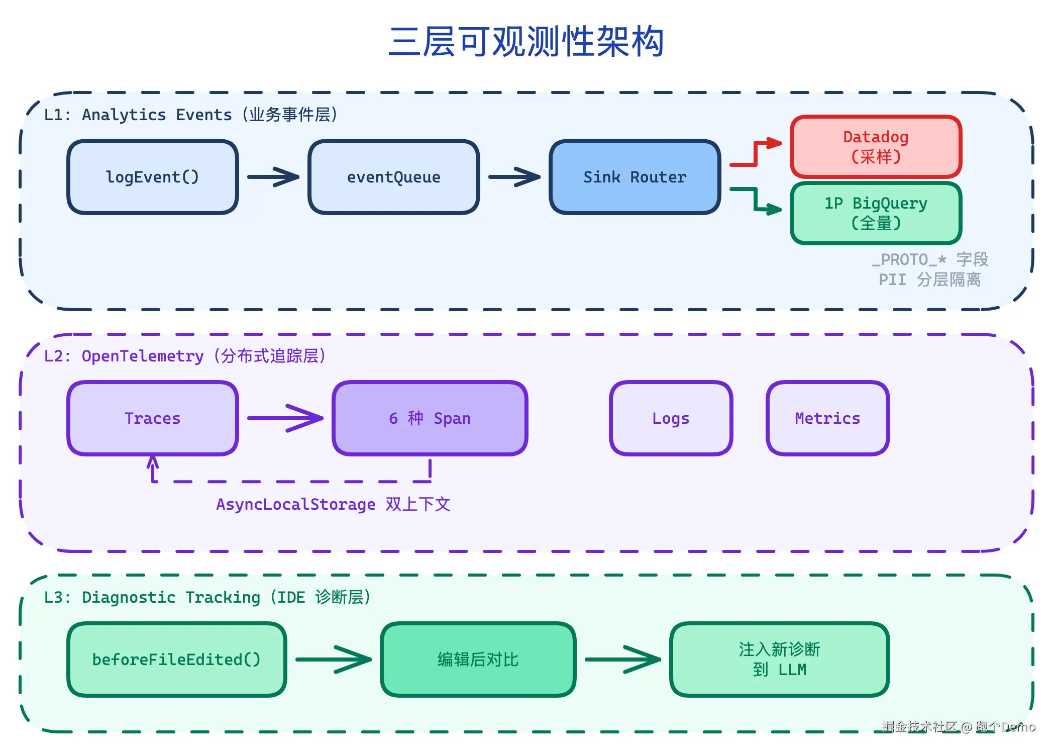 如果三层系统共享同一个数据管道,一个 Datadog 的配置错误就可能泄露文件路径。_PROTO_* 机制的本质是:记录一切,但让不同的消费者只看到自己该看的。