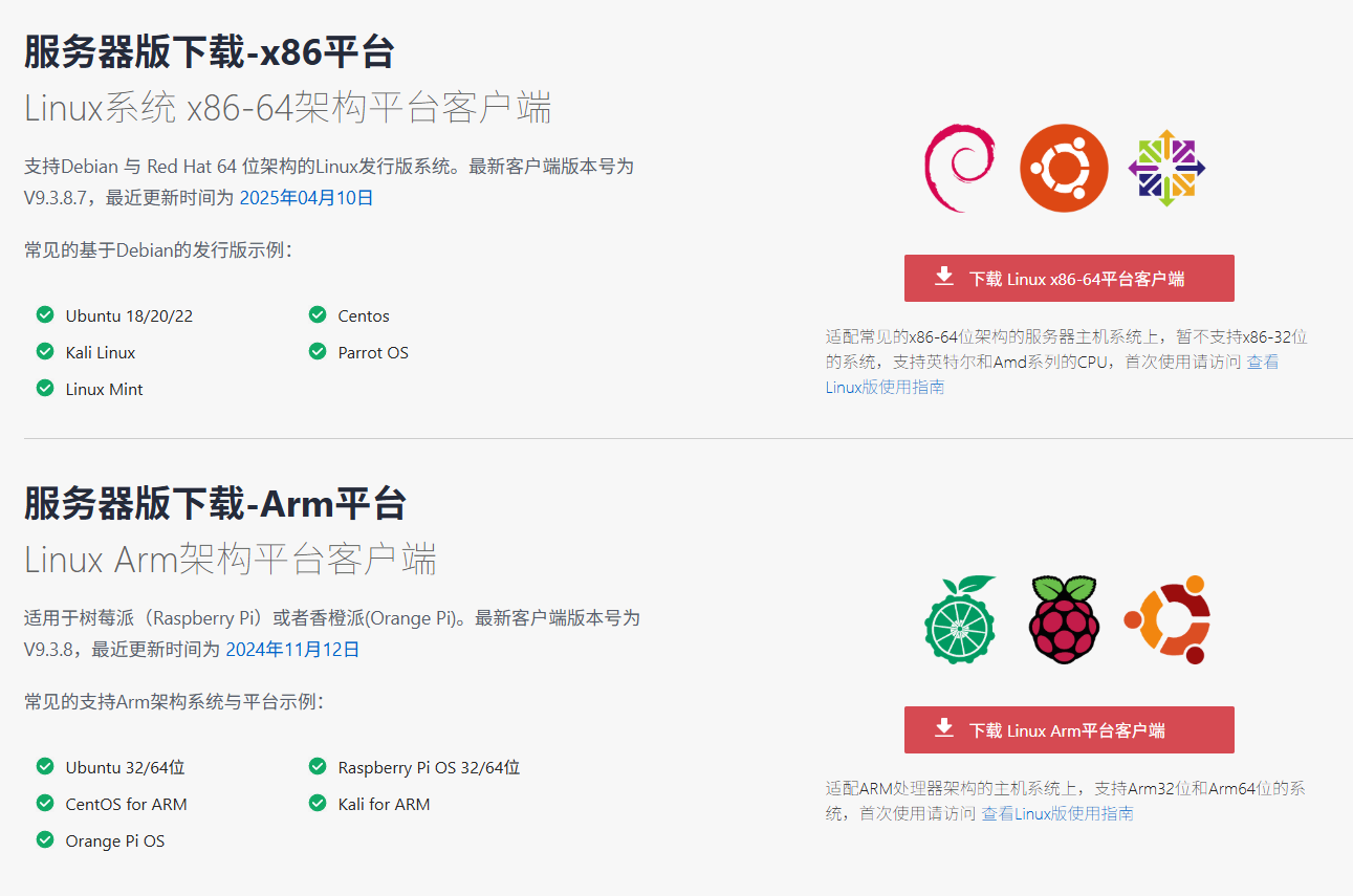 - 系统要求:Linux Arm架构(Arm32/64位),适配树莓派OS、Ubuntu 32/64位(Arm)、CentOS for ARM、Kali for ARM、Orange Pi OS等,最新客户端版本号为V9.3.8,最近更新时间为2024年11月12日;