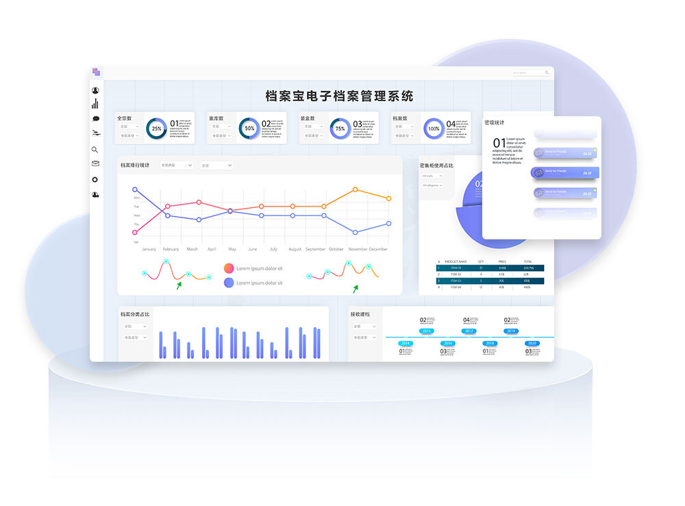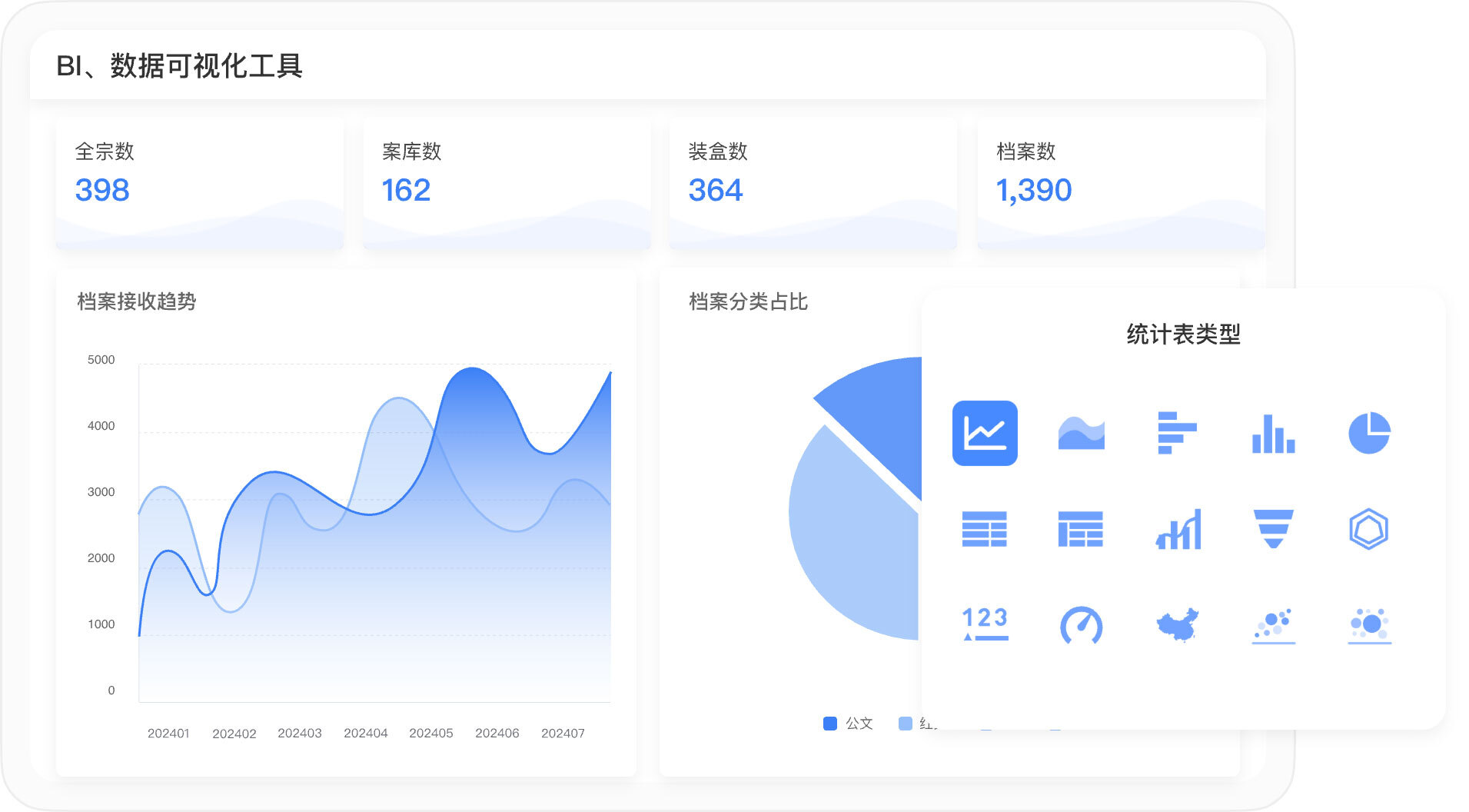 - 档案总量、增长趋势、分类分布、利用频率等数据一目了然