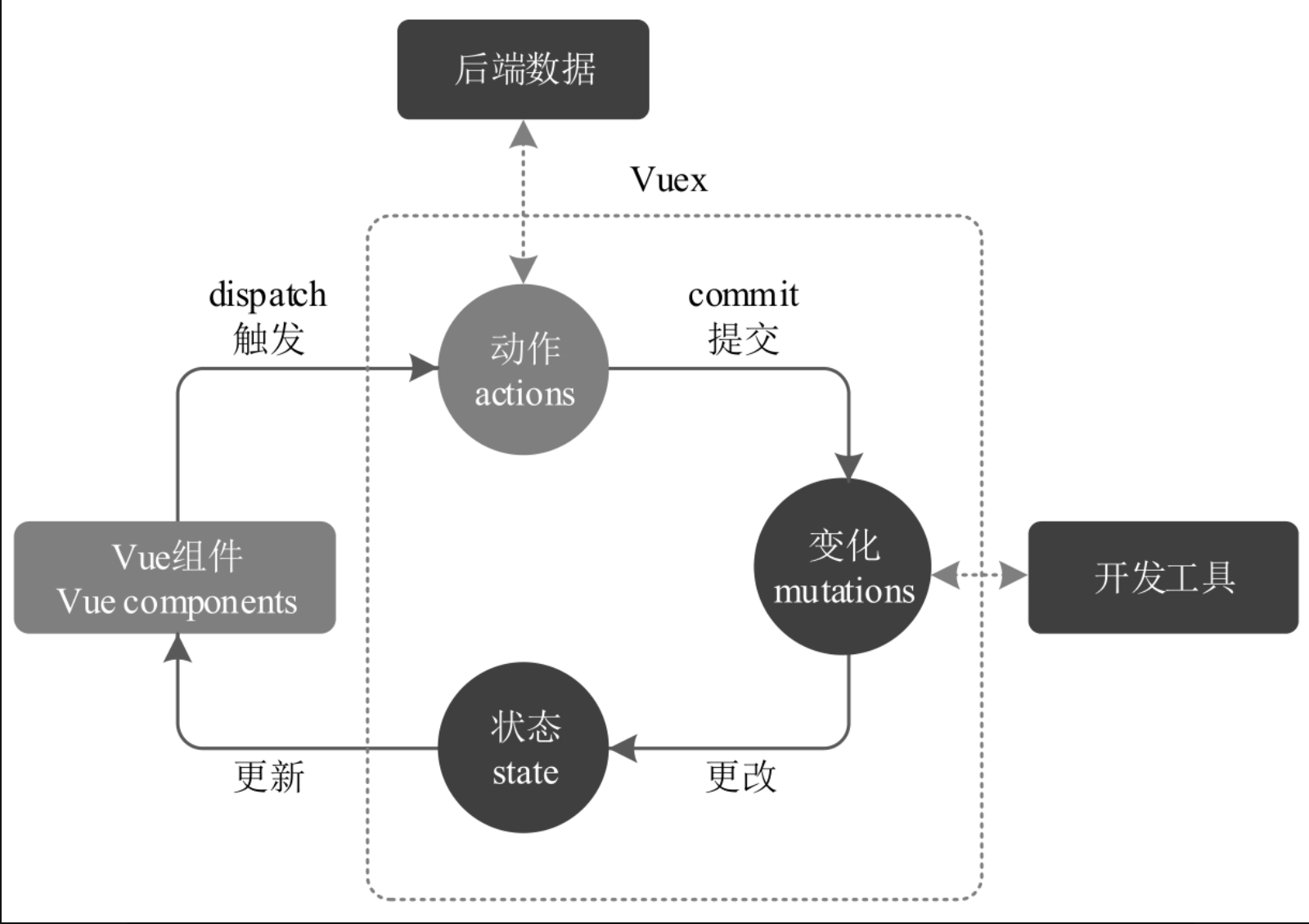 用户在Vue组件中通过dispatch方法触发一个action,在action中通过commit方法提交一个mutation,通过mutation对应的函数更改一个新的state值,Vuex就会将新的state值渲染到组件中,从而实现界面的更新。