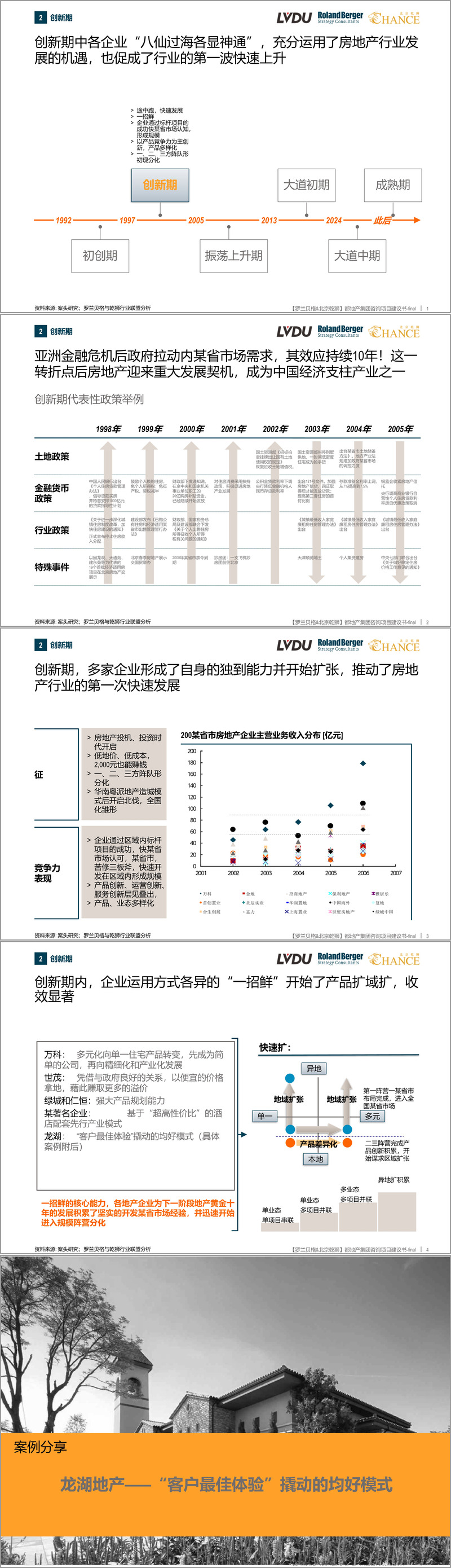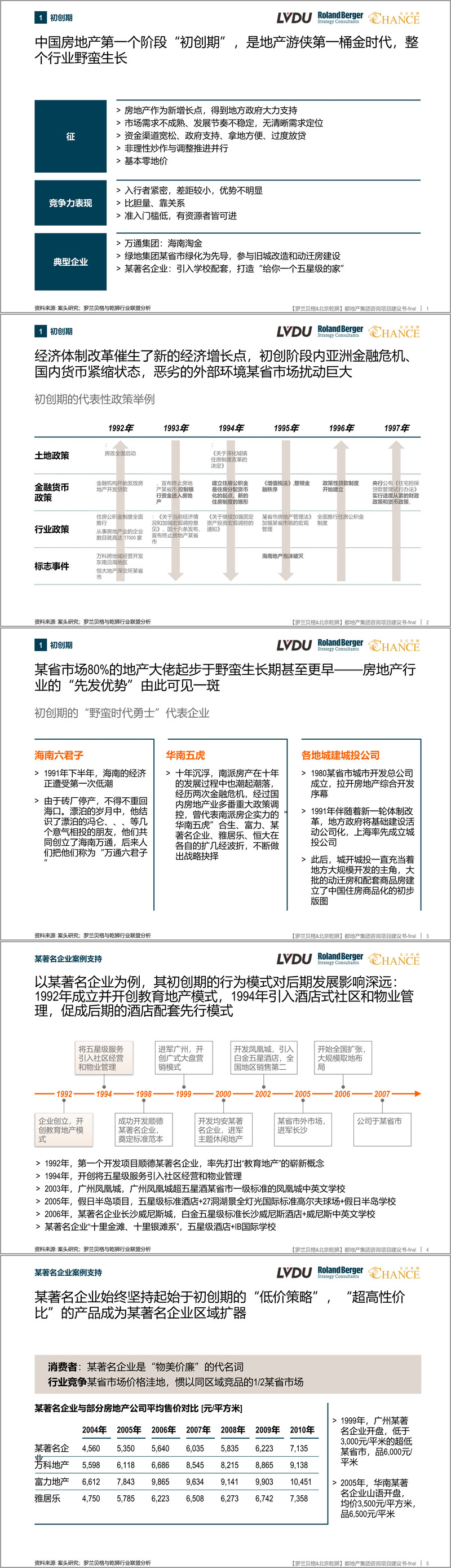 在行业分析部分,方案将中国房地产发展划分为六个阶段:初创期(1992-1997)、创新期(1997-2005)、振荡上升期(2005-2013)、大道初期(2013-2024)、大道中期(2024-2035)和成熟期(2035以后)。每个阶段都呈现出不同的市场特征和企业行为模式。通过对各阶段典型企业案例的深入剖析,揭示了行业发展的内在规律和成功企业的关键成功因素。