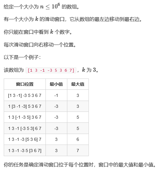 O (n) 时间复杂度,解决滑动窗口内的最大值、最小值问题,暴力解法需要 O (nk),是滑动窗口极值问题的唯一最优解。