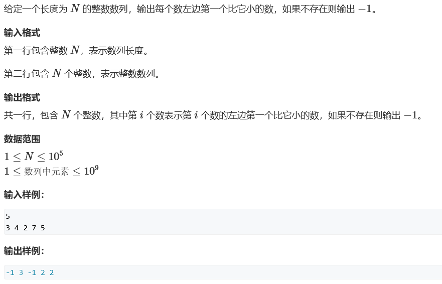 tt--)直到栈空 或 栈顶 < x 为止 - 经过上面的循环,栈顶就是左边第一个比 x 小的数,如果栈空 → 输出 -1,否则 → 输出栈顶。