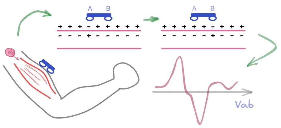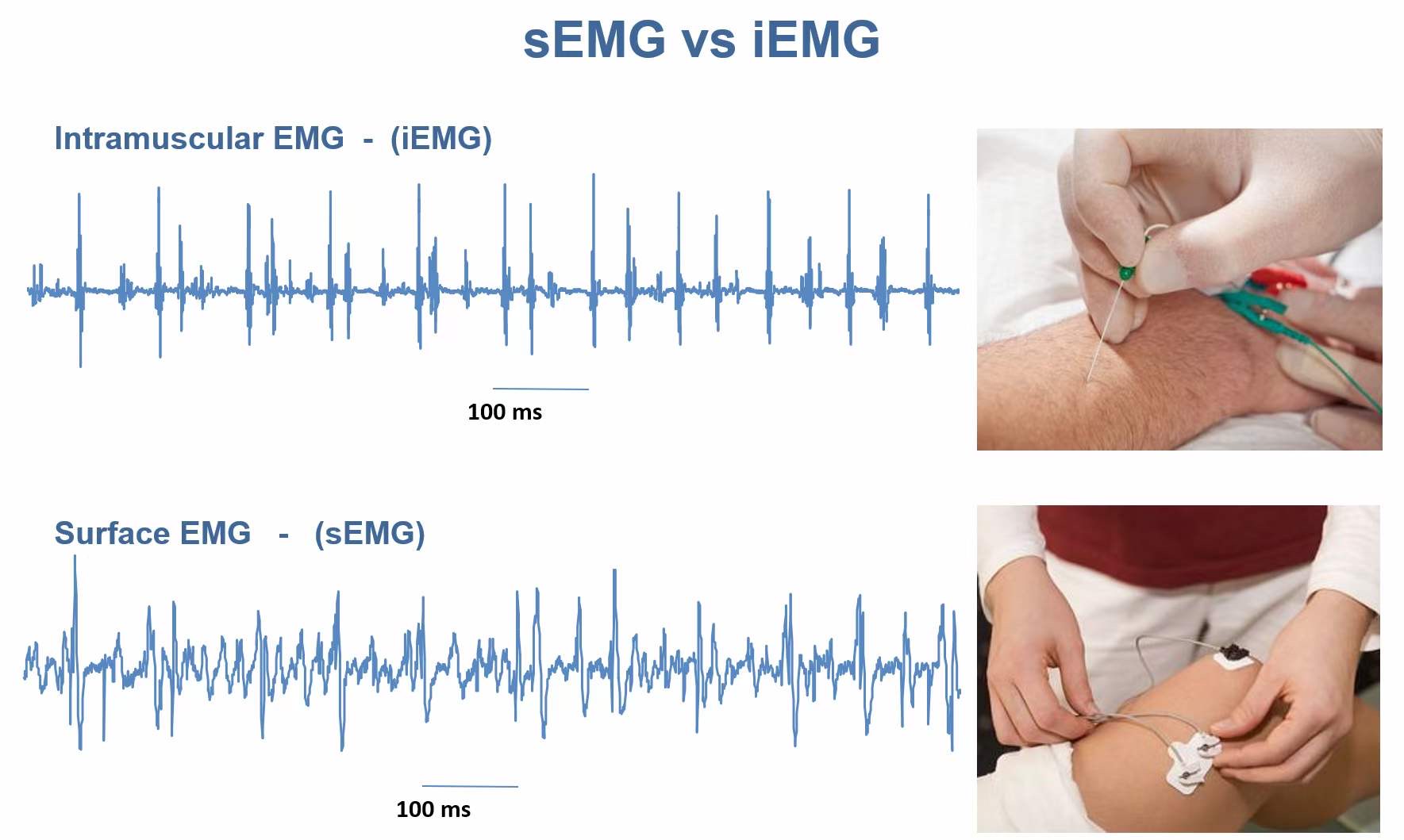 从细胞外记录的角度看,单个运动单位动作电位(MUAP)并非单一尖峰,而是一个具有三相或双相波形的电偶极子传播过程,其时程约为3--10 ms,幅度在微伏至毫伏量级。当多个运动单位被同步募集后,不同MUAP在时间和空间上叠加,形成表面肌电信号(surface EMG, sEMG)或针极肌电信号(intramuscular EMG, iEMG)。sEMG通过贴附于皮肤表面的差分电极采集,反映的是电极下方一定深度和范围内所有活跃运动单位的时空总和;iEMG则通过穿刺电极深入肌腹,可记录单个MUAP甚至单纤维电位,但具有侵入性。工程应用中,sEMG因无创、便捷而成为主流选择,但其信号是深层与表层运动单位电场的容积导体混合结果,空间分辨率有限。