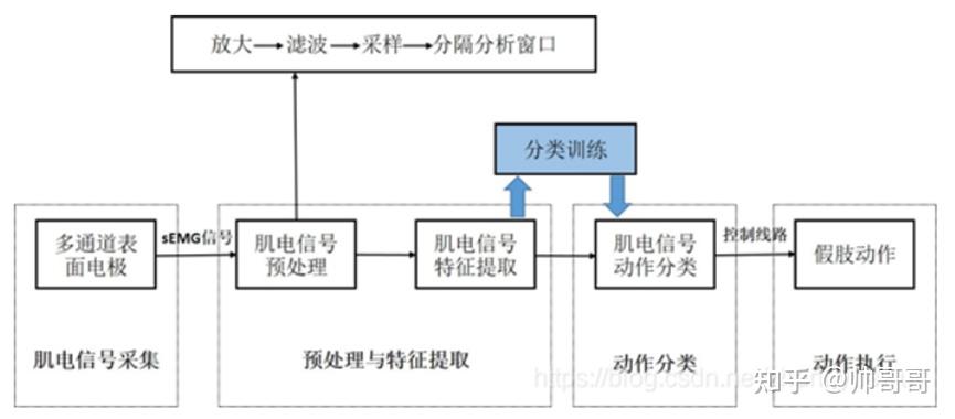 采集系统的硬件链路通常遵循"电极→仪表放大→带通滤波→二级放大→模数转换"的架构。电极采用三点式差分配置:两个输入电极置于肌腹上方,间距约1--2 cm,方向与肌纤维走向平行;参考电极置于远离目标肌肉的骨性突起或 electrically neutral 区域。仪表放大器(Instrumentation Amplifier)作为第一级,必须具备极高的共模抑制比(CMRR,通常要求>80 dB),以抑制肢体作为天线接收的共模电磁干扰。信号经第一级放大后,需通过带通滤波器保留10--500 Hz有效成分,同时抑制高频噪声与低频漂移。由于sEMG信号幅度微弱,两级放大设计可避免单级高增益导致的饱和失真。