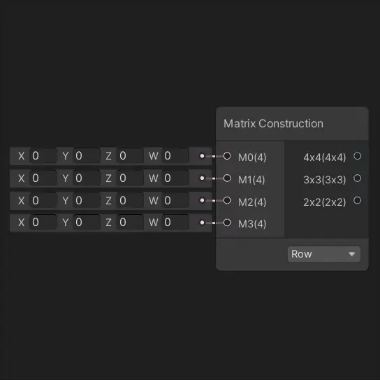 Matrix Construction 节点的核心功能是从四个输入矢量 M0 、M1 、M2 和 M3 构造方阵。这种设计提供了极大的灵活性,允许开发者根据需要生成矩阵 2x2 、矩阵 3x3 和矩阵 4x4 类型的矩阵。每种矩阵类型在图形编程中都有其特定的应用场景和优势。