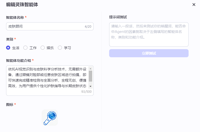 基于需求分析,确定智能体定位为"生活健康类-皮肤检测与护肤辅助",名称为皮肤顾问,同时明确人设为专业、友好的随身皮肤助手,回复逻辑简洁口语化,适配眼镜语音播报场景。