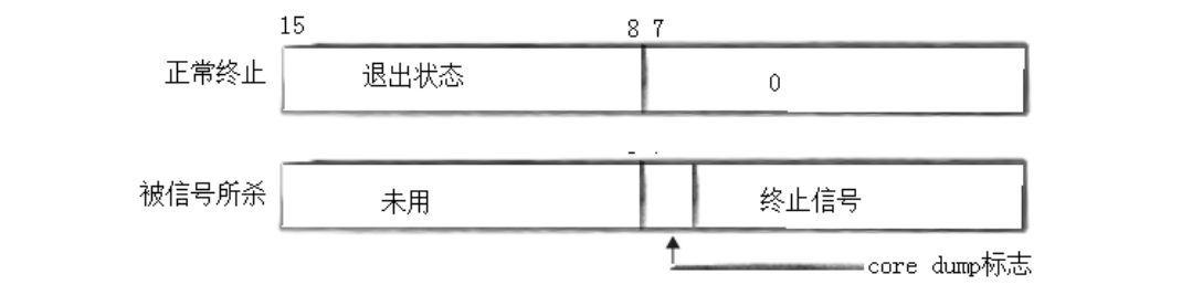 signumber),表示进程是不是被信号杀死的; - 第 8-15 位 :退出码(