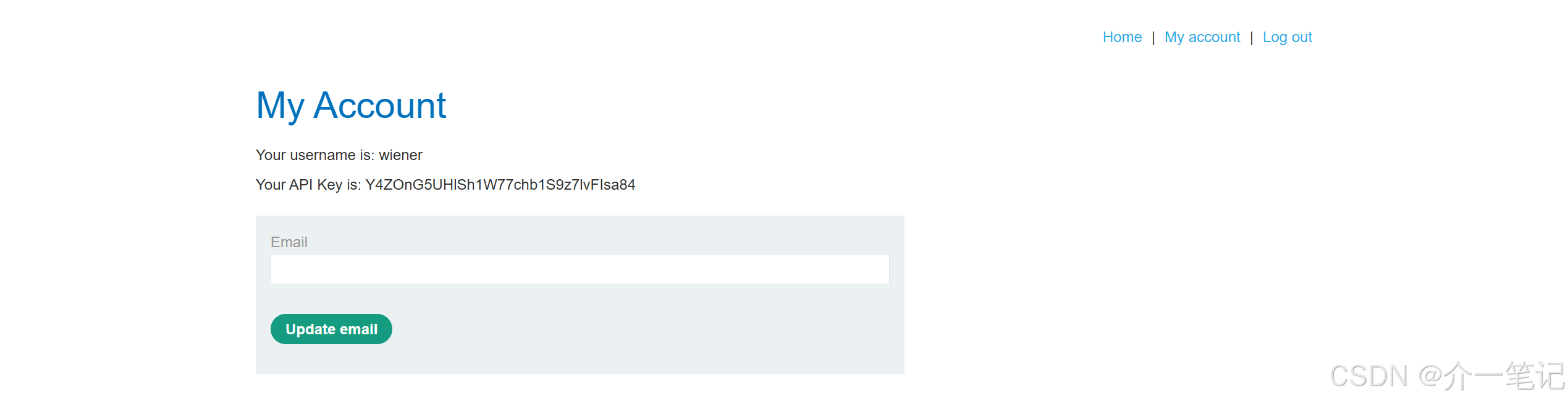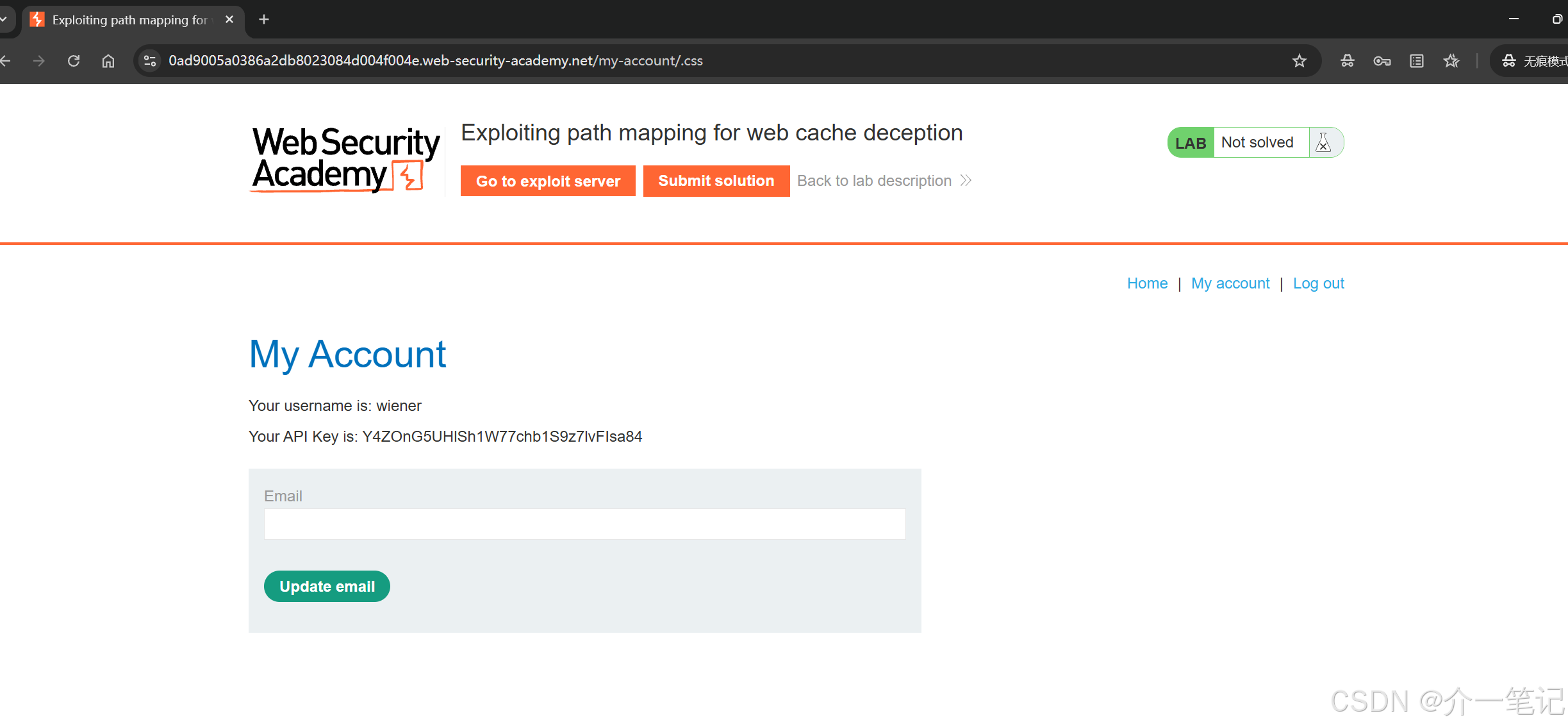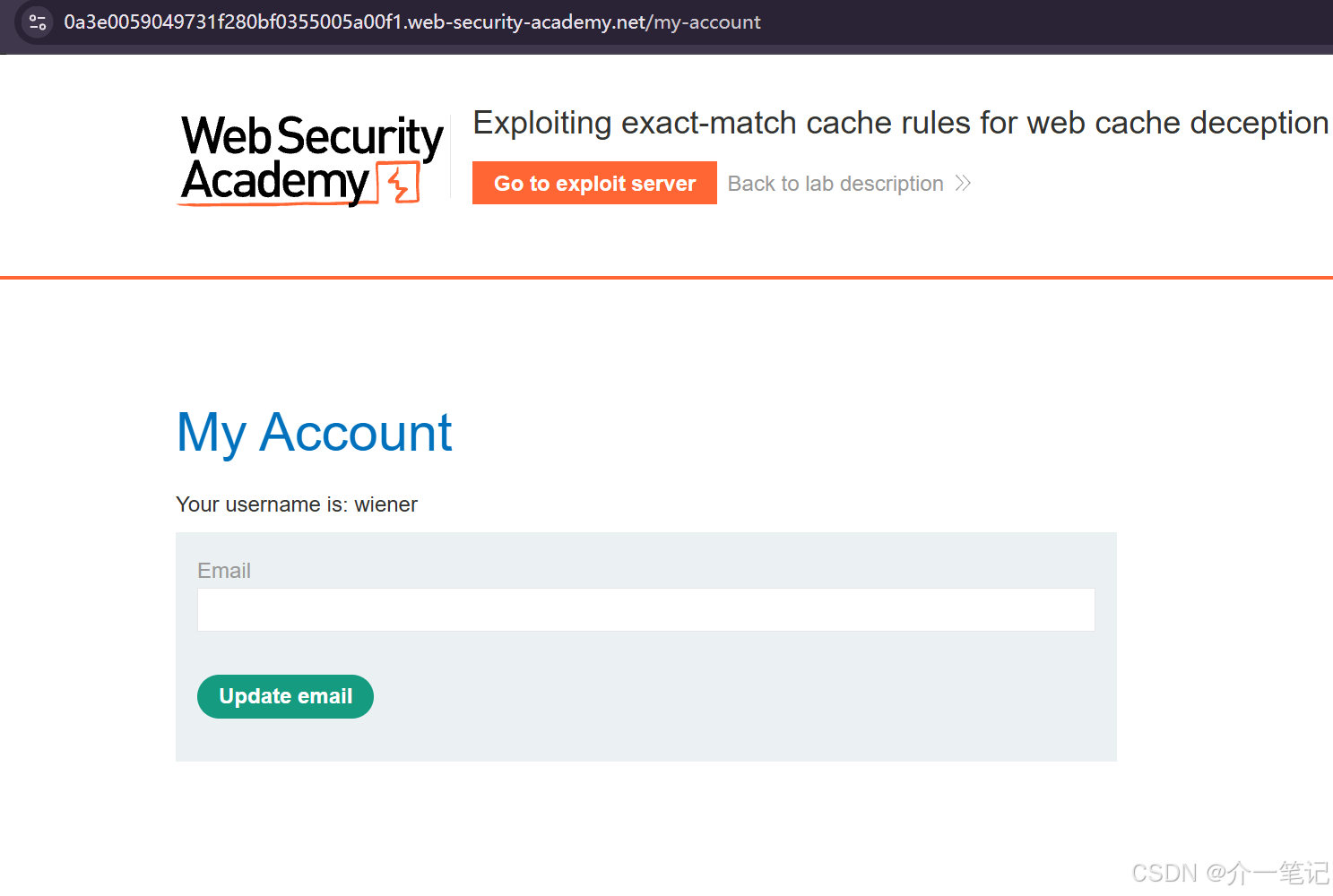 实验地址:https://portswigger.net/web-security/web-cache-deception/lab-wcd-exploiting-exact-match-cache-rules 。这次是缓存欺骗结合CSRF的场景,这里只演示对CSRF令牌的缓存利用。登录后页面如下: