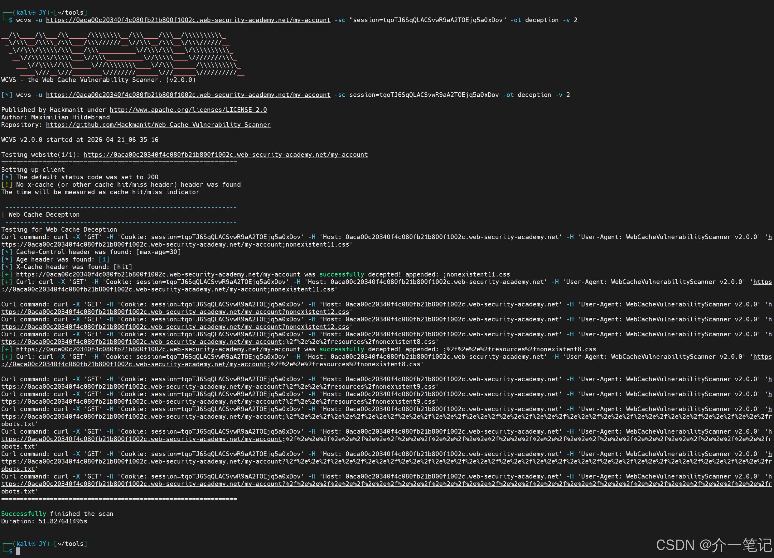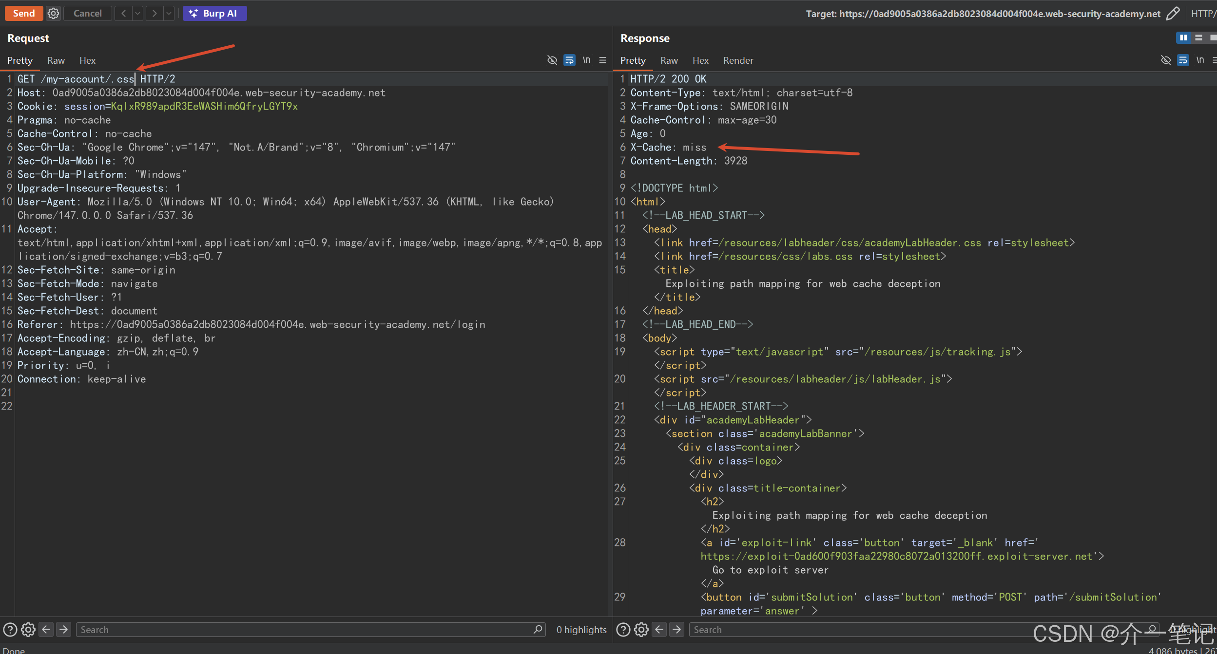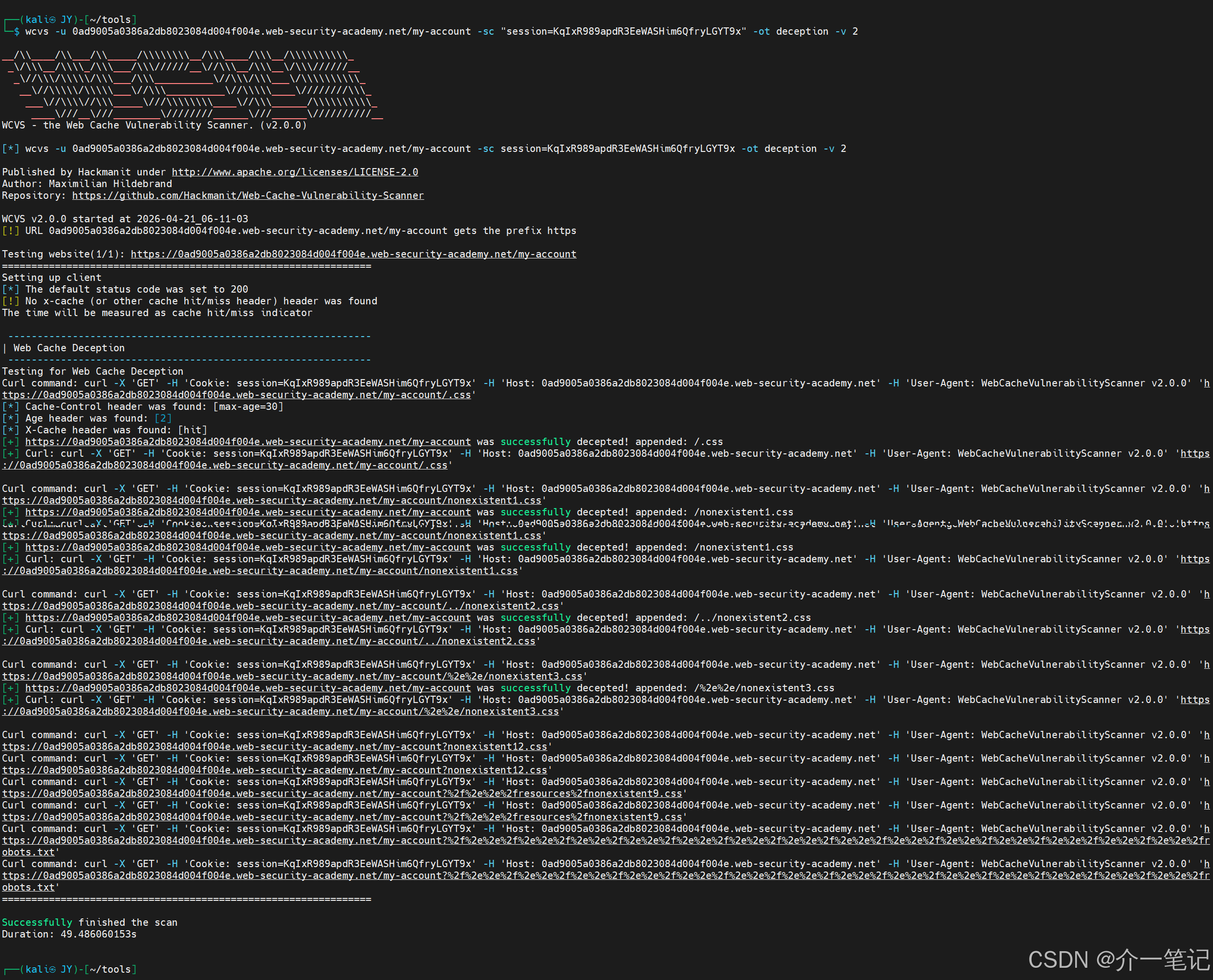 实验地址:https://portswigger.net/web-security/web-cache-deception/lab-wcd-exploiting-path-delimiters 。注意,检测命令里URL末尾别带斜杠 /。