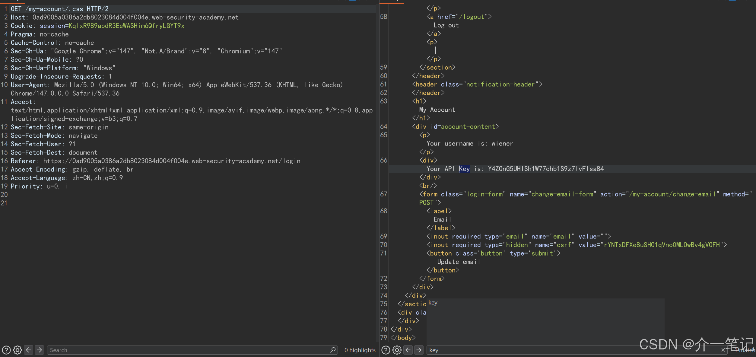 本次实验地址为:https://portswigger.net/web-security/web-cache-deception/lab-wcd-exploiting-path-mapping 。登录 My Account 后,页面地址为 https://xxx.net/my-account ,此页面会显示当前账户的 key,这是敏感信息。