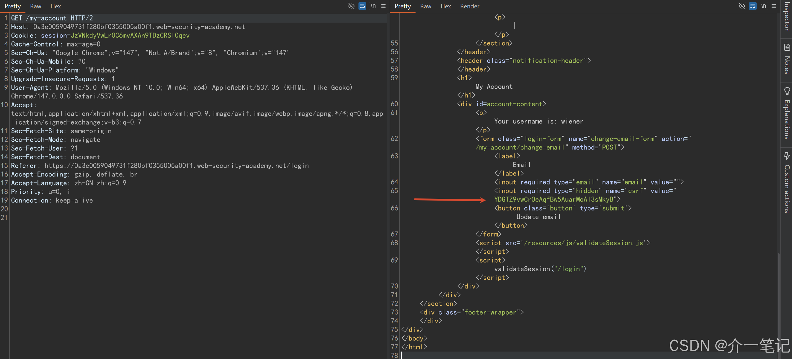 抓包看响应内容,页面里有用户相关的CSRF token。