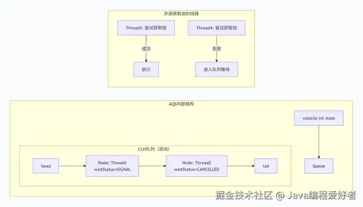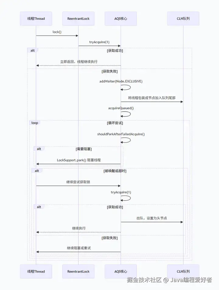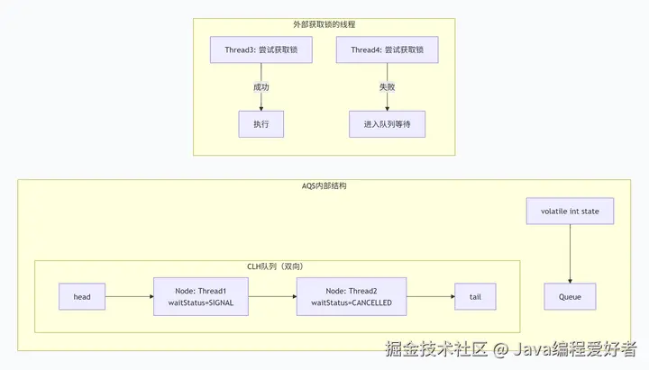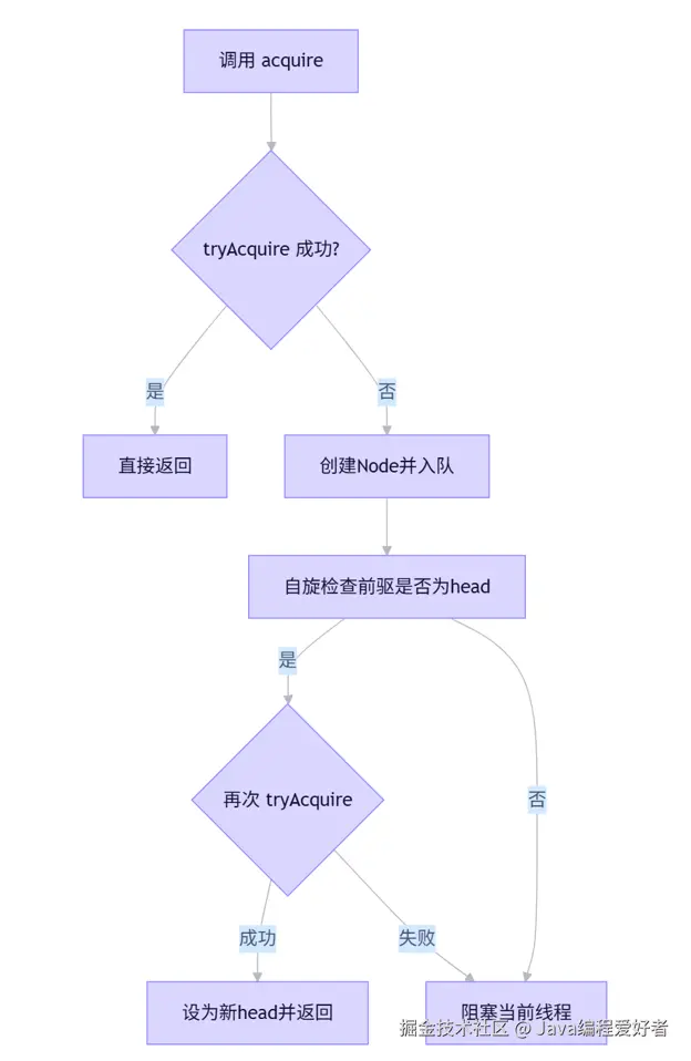 sync.acquire(1); // 调用AQS的模板方法 abstract static class Sync extends AbstractQueuedSynchronizer { // AQS.acquire()的调用链: // 1. tryAcquire() 尝试获取锁(子类实现) // 2. addWaiter() 创建节点加入队列 // 3. acquireQueued() 在队列中自旋/阻塞 // 4. 如果被中断过,自我中断恢复状态
