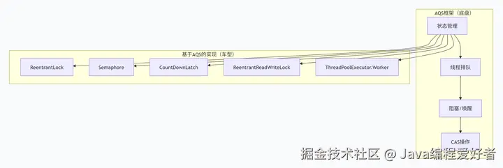 AQS(AbstractQueuedSynchronizer) 不是一个具体的锁,而是一个构建锁和同步器的框架。你可以把它想象成汽车工厂的"底盘平台":同样的底盘可以造出轿车、SUV、卡车等各种车型。