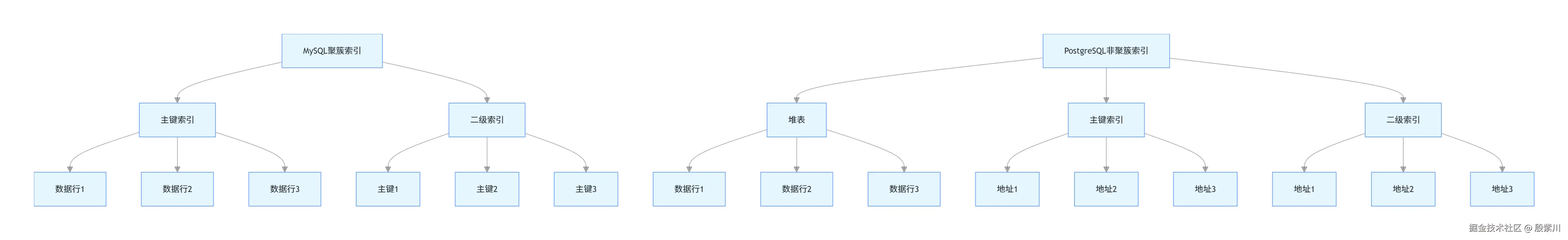 PostgreSQL采用堆表组织方式,数据存储在堆中,索引则存储指向堆中数据行的物理地址。这种设计使得二级索引查询只需要一次查找,但主键查询的效率相对较低。PostgreSQL还支持多种索引类型,包括B树、哈希、GiST、SP-GiST、GIN和BRIN等。