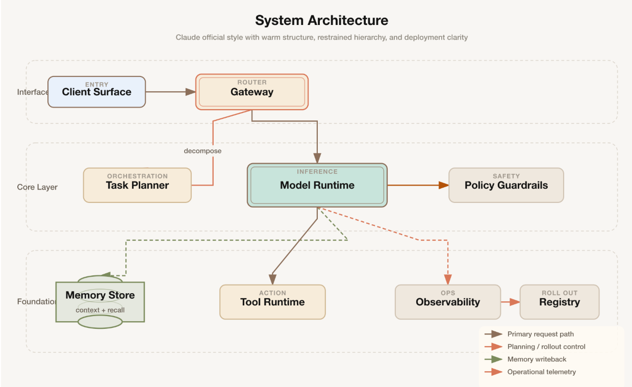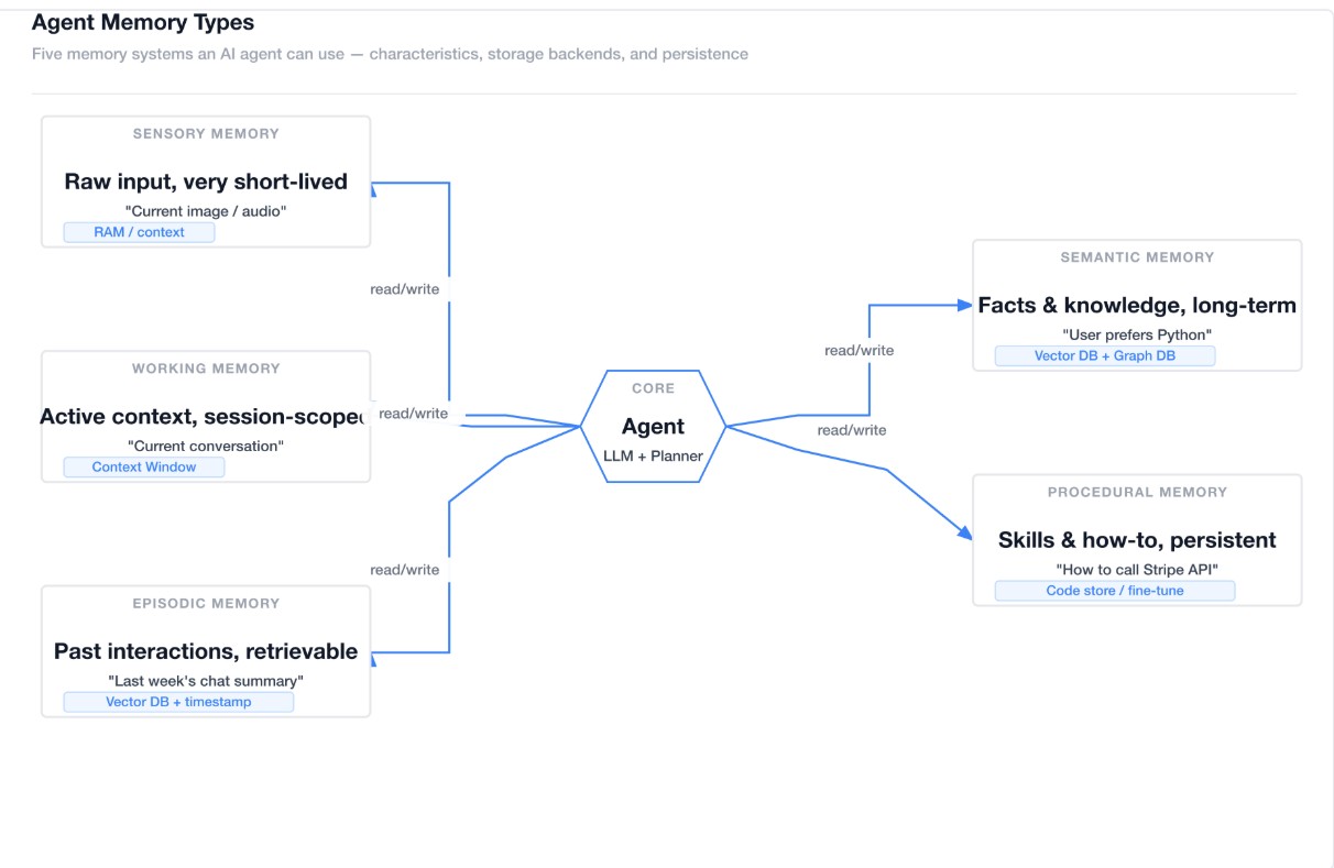 用不同的箭头颜色分隔写入路径和读取路径。内存管理器处理两种操作:在写入路径上写入VectorDB和GraphDB,在读取路径上检索和排名。这种双路径可视化对于理解内存增强的AI系统至关重要。