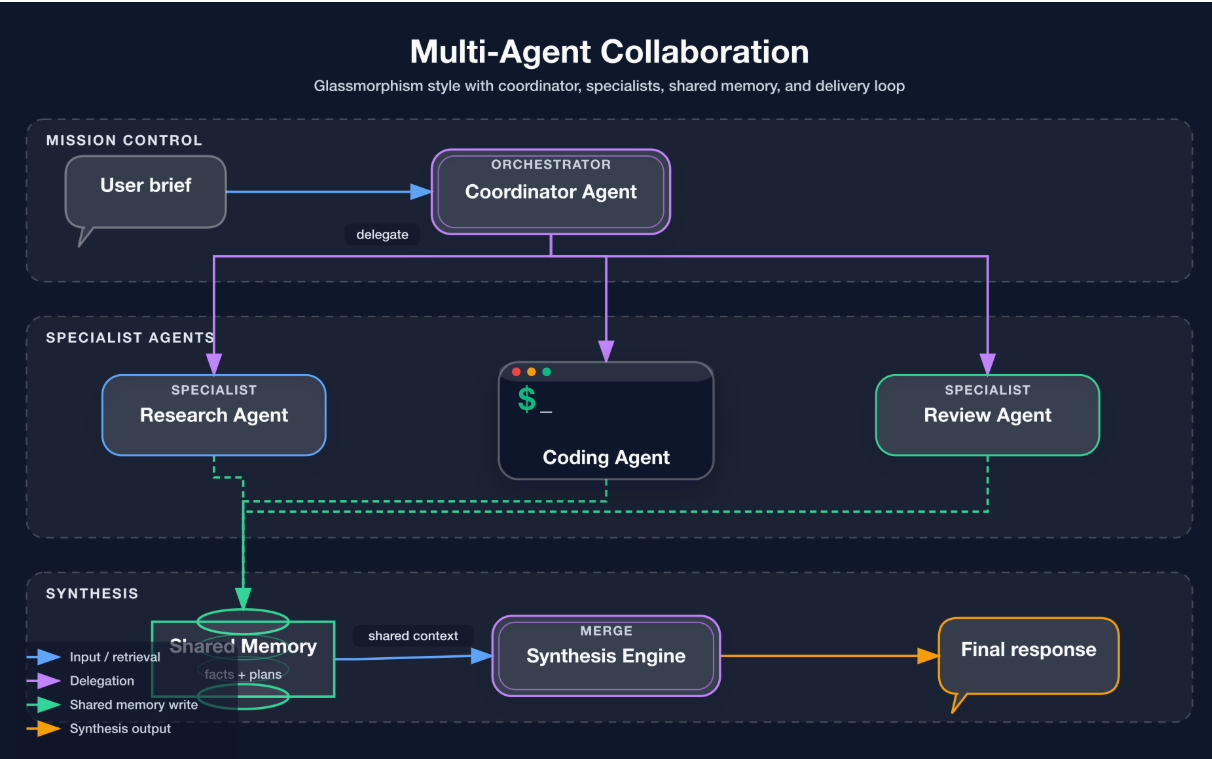 显示经典的编排器→子代理→聚合器→输出拓扑。从编排器到子代理A、B、C的扇出,然后是到聚合器的扇入,是典型的多代理协调模式。
