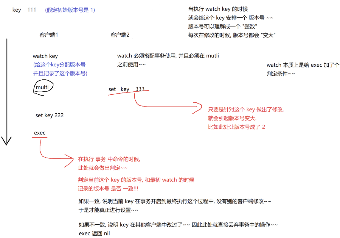 EXEC → 执行事务(如果被监视的 key 未被修改,则事务成功执行)