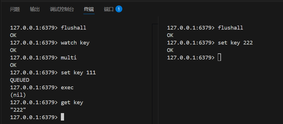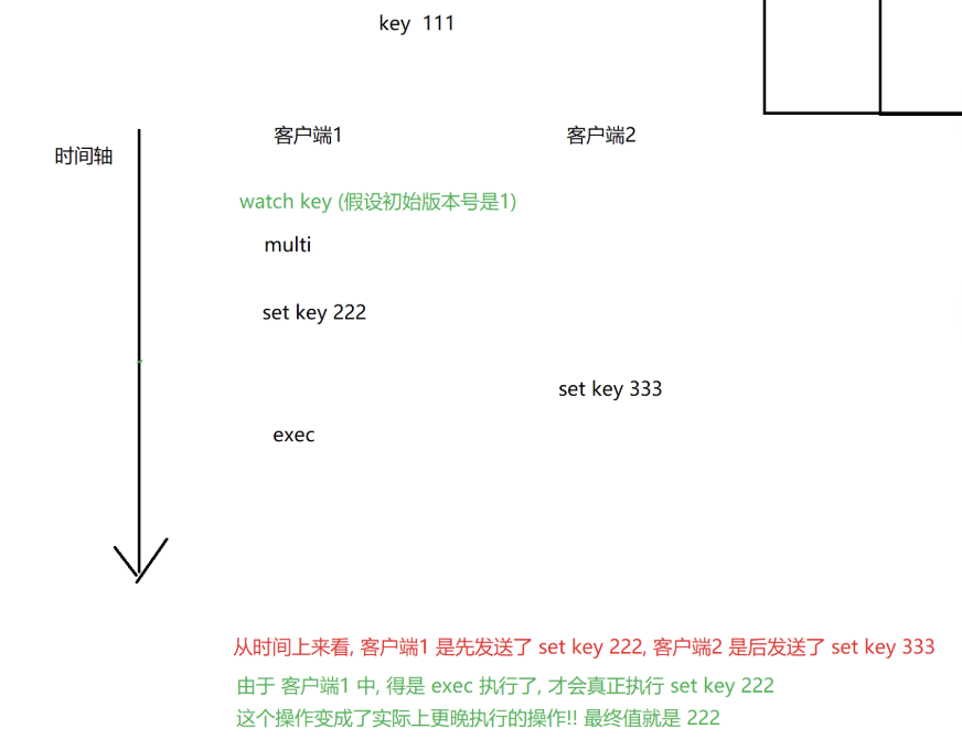 如图,watch key后,另一客户端修改key之后,再执行exec会发现返回nil,随后get key得到的值为被修改后的值222