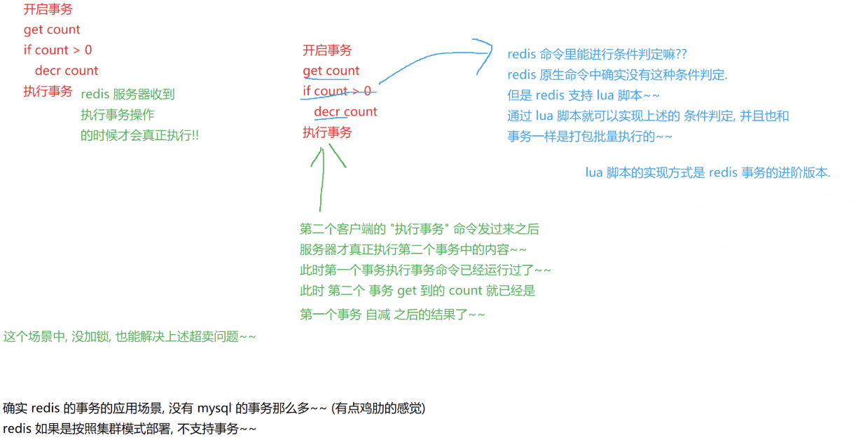 • 弱化的原子性: redis 没有 "回滚机制" . **只能做到这些操作 "批量执行".**不能做到 "一个失败就恢复到 初始状态".也就是说redis的原子性不确保执行是否成功,没有回滚机制,不能回滚