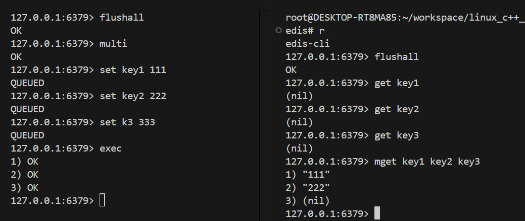执行multi后,并没有真正执行,可以看到返回结果时queued,此时只是讲这多个请求保存在了服务器的事务队列中,此时另开一个窗口可以看见,是无法查询到key对应的值的。