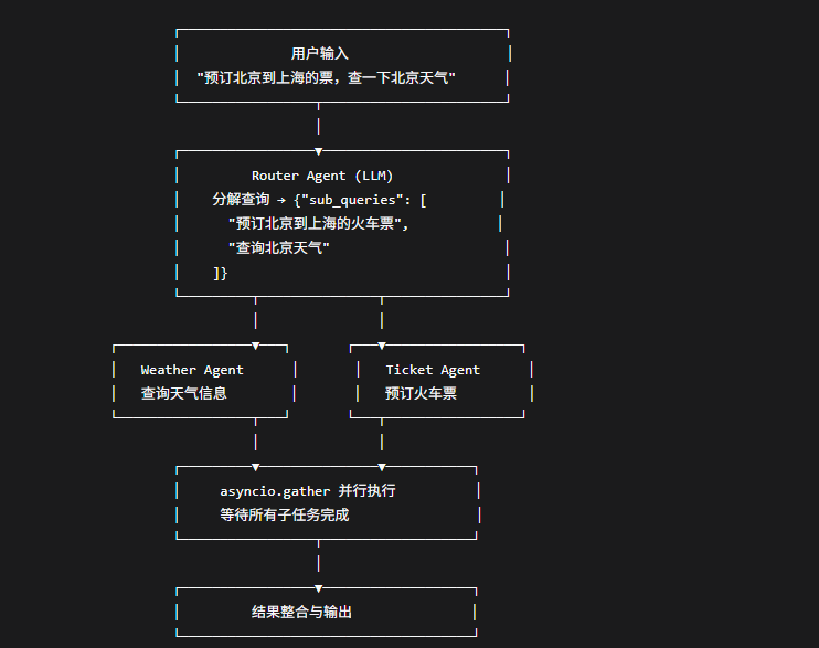 [步骤1-分解] 2个子任务: ['预订一张从北京到上海的火车票', '查询一下北京天气']