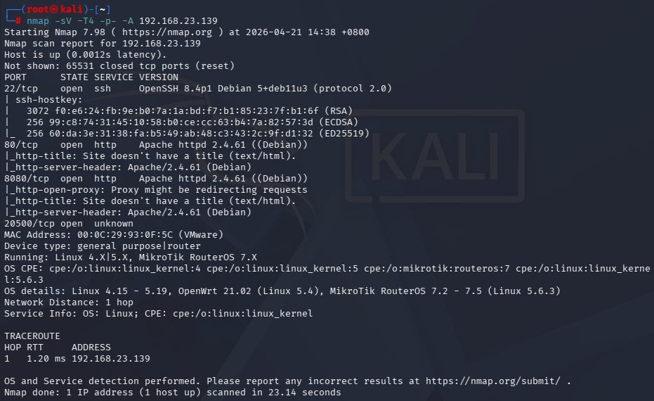 nc -nv 192.168.23.139 20500,连上后尝试输入HELP、GET /或随便敲点字符看回显。 - 深度脚本扫描 :使用 Nmap 默认指纹脚本: