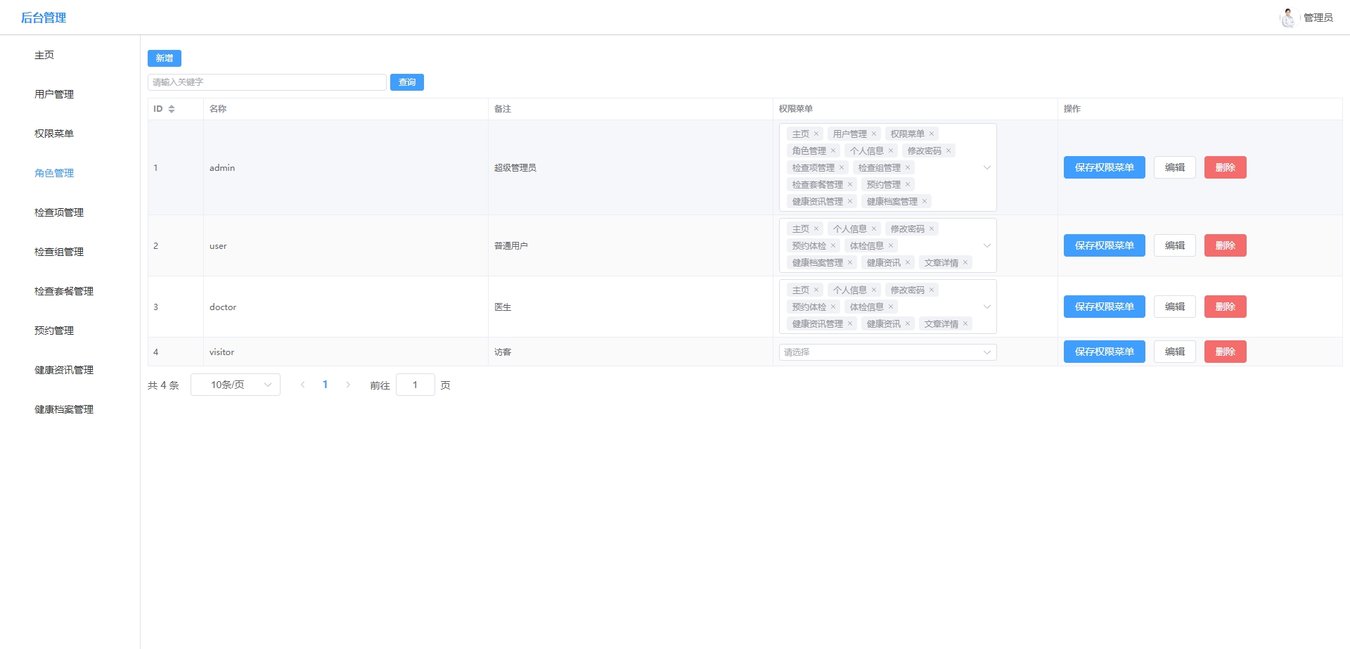 - role:角色表,定义系统角色(管理员、用户、医生、访客)