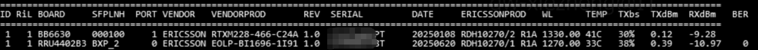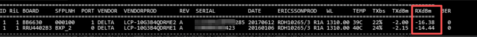 新建LTE小区,光路通,RRU状态正常,无硬件告警;但提取光路、RRU信息,发现BBU-RRU两端均出现收光弱问题,如下: