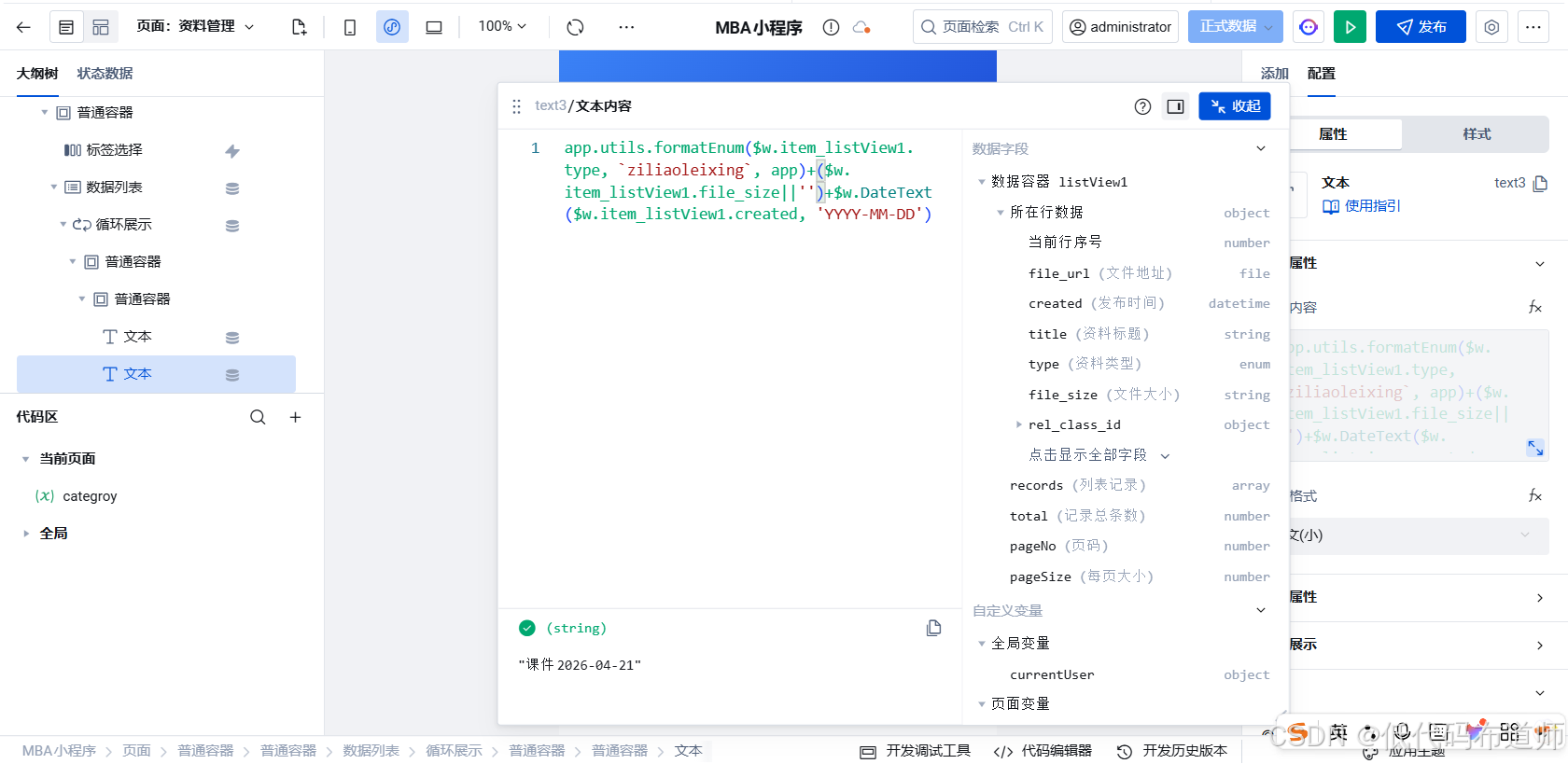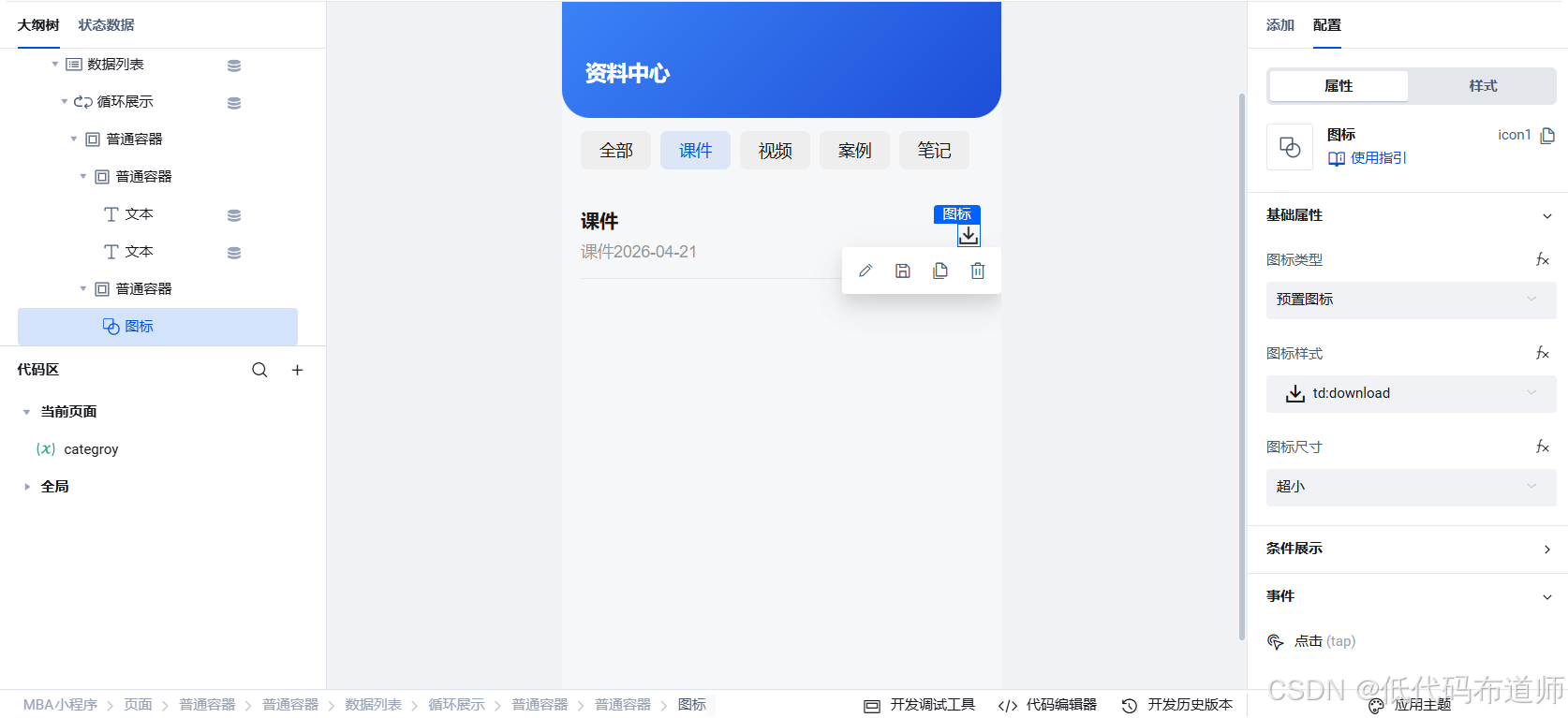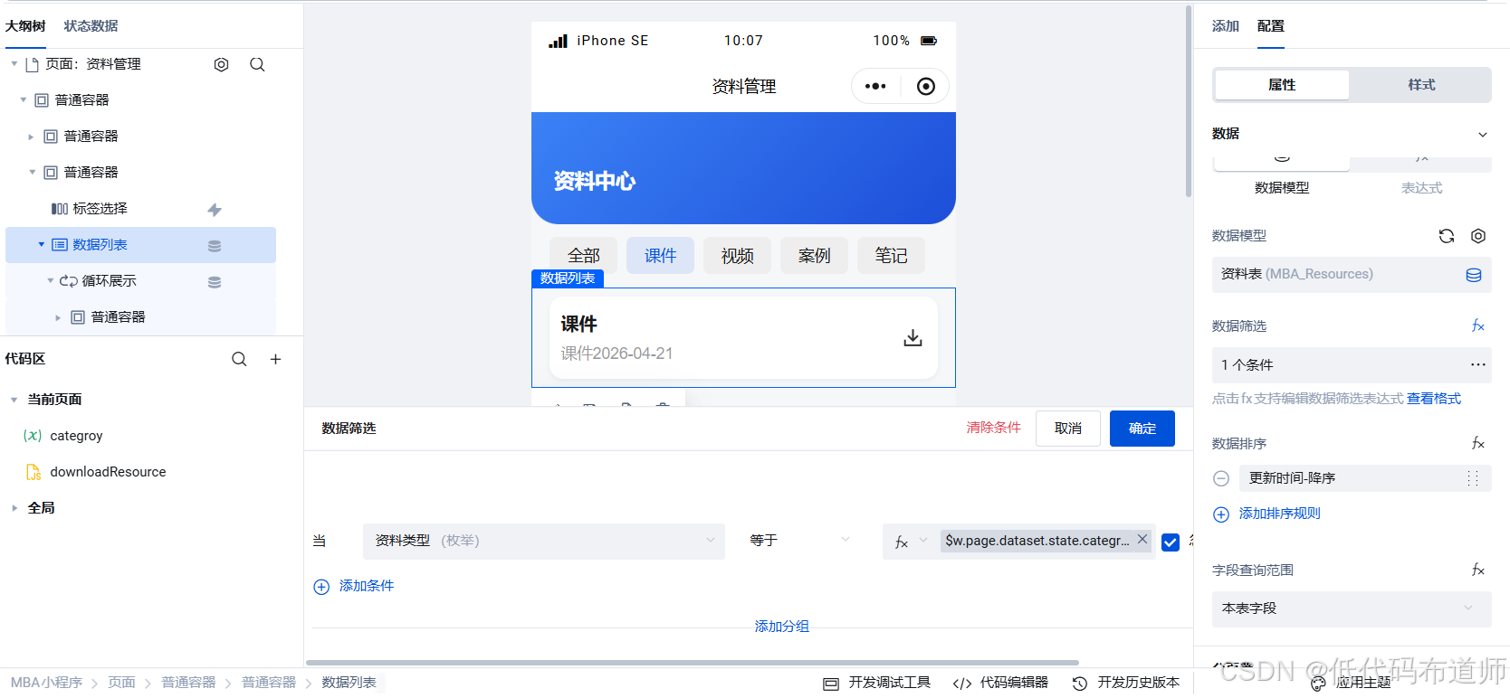 数据列表设置数据筛选,课件类型等于我们的自定义变量