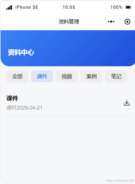 - 小程序端资料中心:资料列表展示,分类筛选,文件下载