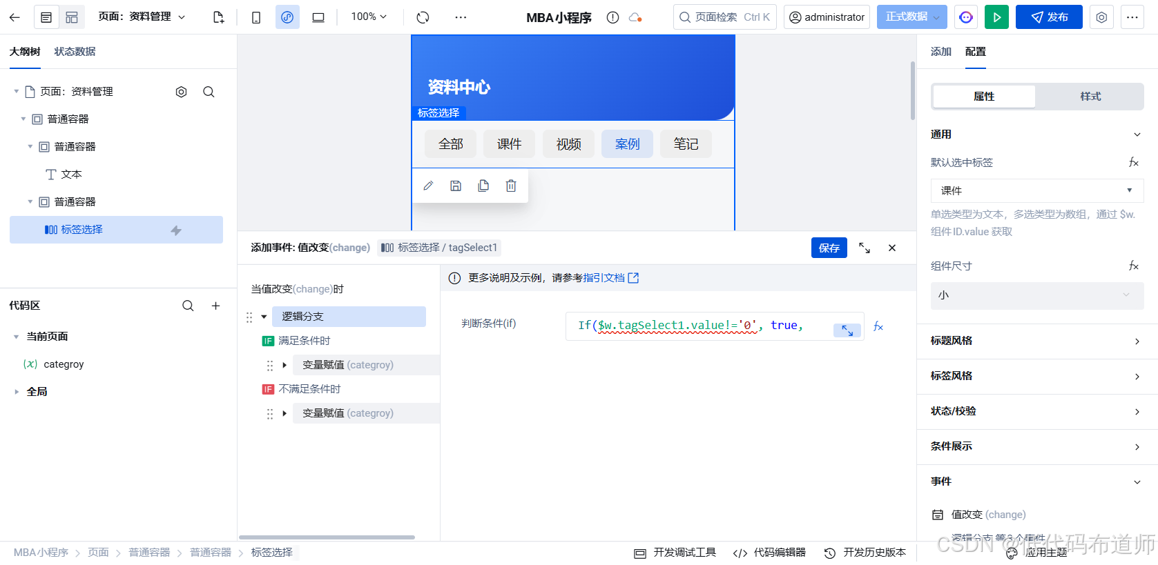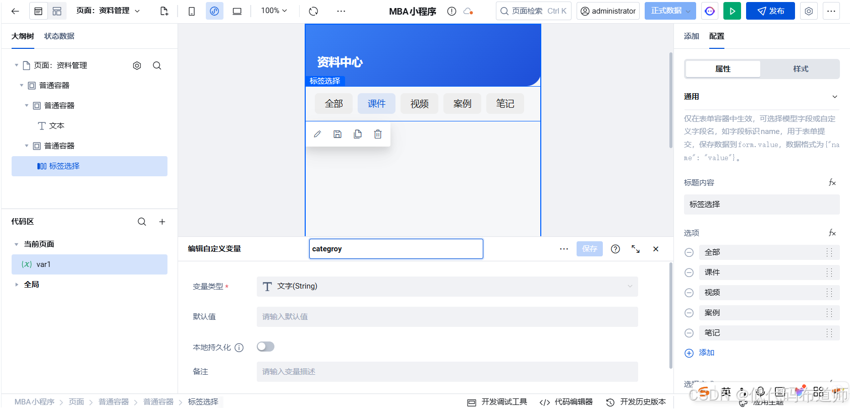 设置标签项为全部、课件、视频、案例、笔记,这里全部的值设置为0,其余的按照1、2、3、4的顺序设置