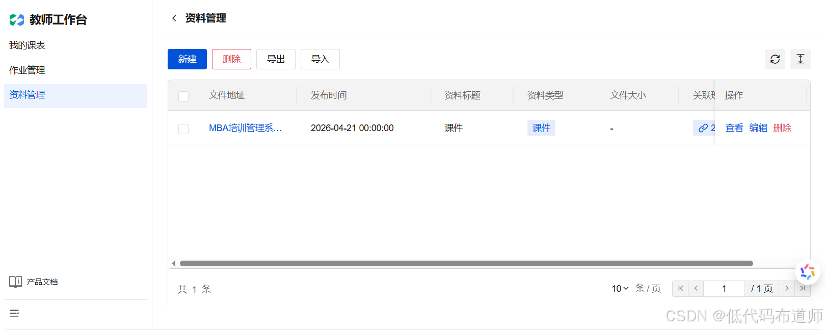 在上一节中,我们完成了作业管理功能。本节我们将实现资料管理功能,包括管理端发布资料和小程序端下载资料。