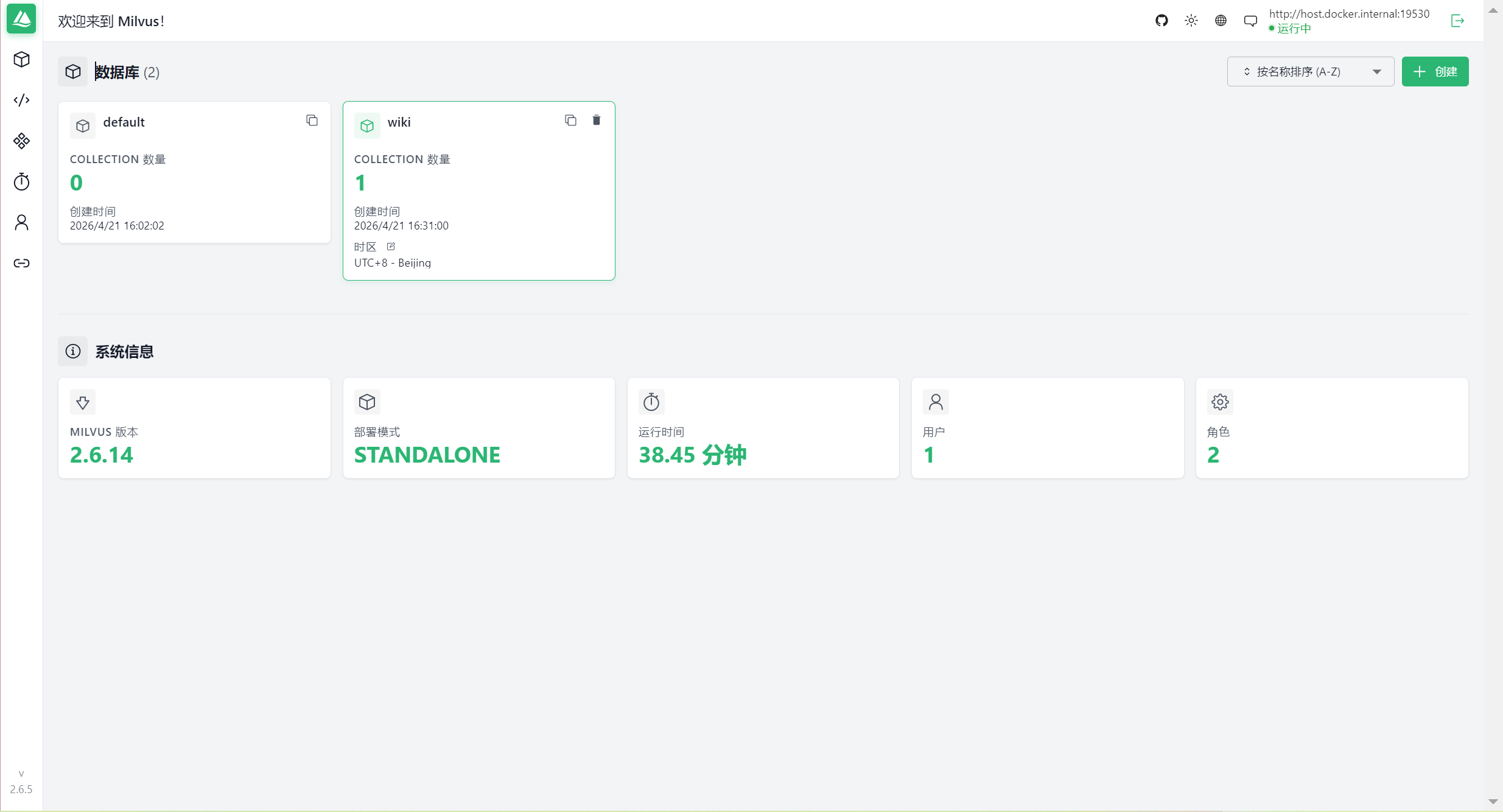 docker run --name milvus-attu -d -p 8100:3000 -e MILVUS_URL=http://host.docker.internal:19530 zilliz/attu:latest