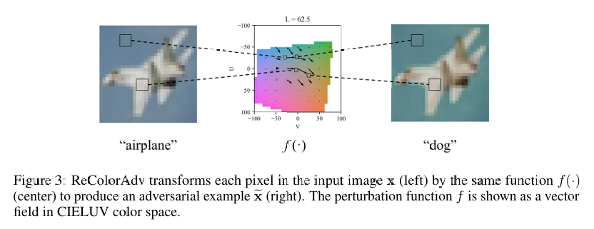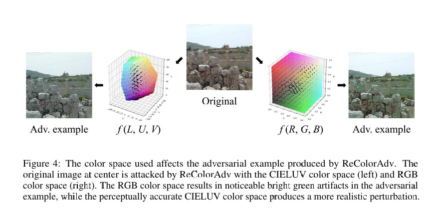 在本文中,我们将专注于其中一个领域------图像------并定义 ReColorAdv,一种对像素颜色的功能对抗性攻击(见图 2)。在 ReColorAdv 中,我们使用一个灵活参数化的函数 fff 将输入中的每个像素颜色 ccc 映射到对抗性示例中的新像素颜色 f(c)f(c)f(c)。我们对 f(⋅)f(\cdot)f(⋅) 进行正则化,既确保没有颜色被扰动超过一定量,又确保映射是平滑的,即相似的颜色以相似的方式被扰动。我们表明,ReColorAdv 可以使用标准的红绿蓝(RGB)颜色空间以及 CIELUV 颜色空间,后者产生的对抗性示例在感知上差异更小(见图 4)。