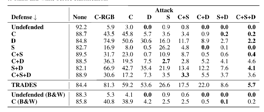 TRADES TRADES 是一种深度神经网络训练算法,旨在通过优化代理损失来提高对对抗性示例的鲁棒性 [30]。该算法是围绕加性威胁模型设计的,但我们评估了一个 TRADES 训练的分类器在所有攻击组合上的表现(见表 1 的第二部分)。尽管该分类器仅基于加性威胁模型训练,但它是针对几乎所有攻击的最佳防御方法。然而,组合的 ReColorAdv + StAdv + delta 攻击仍然将分类器的准确率降低到了 5.7%5.7\%5.7%。