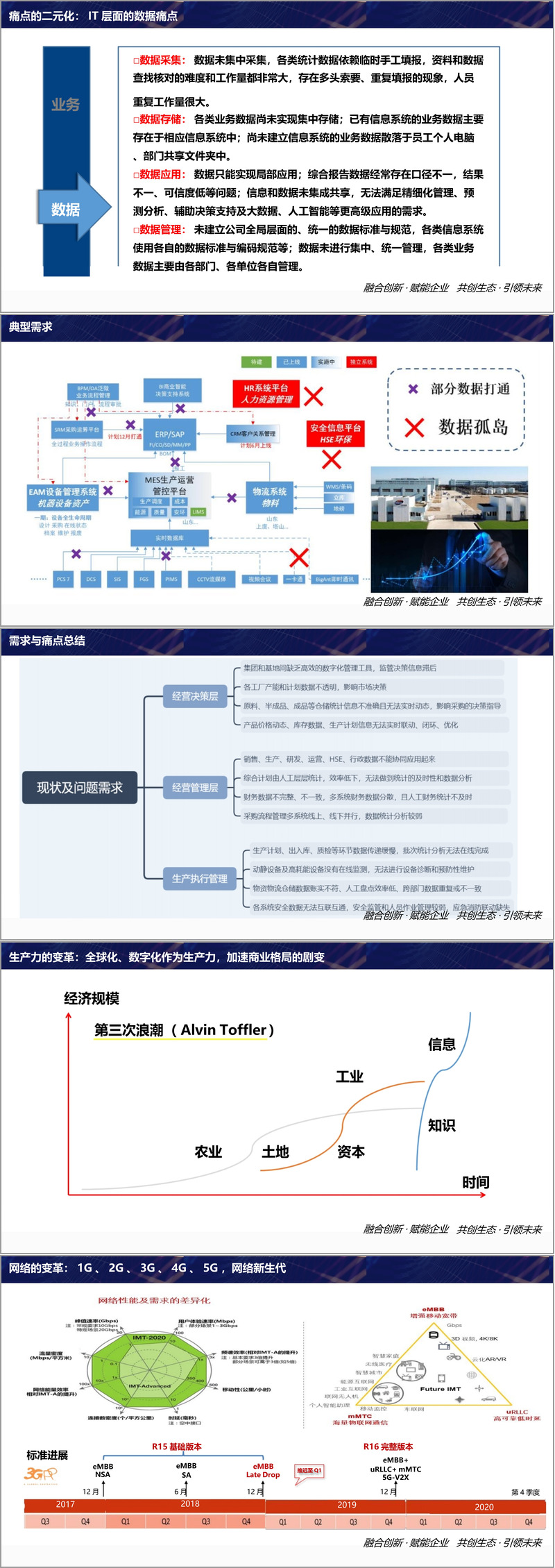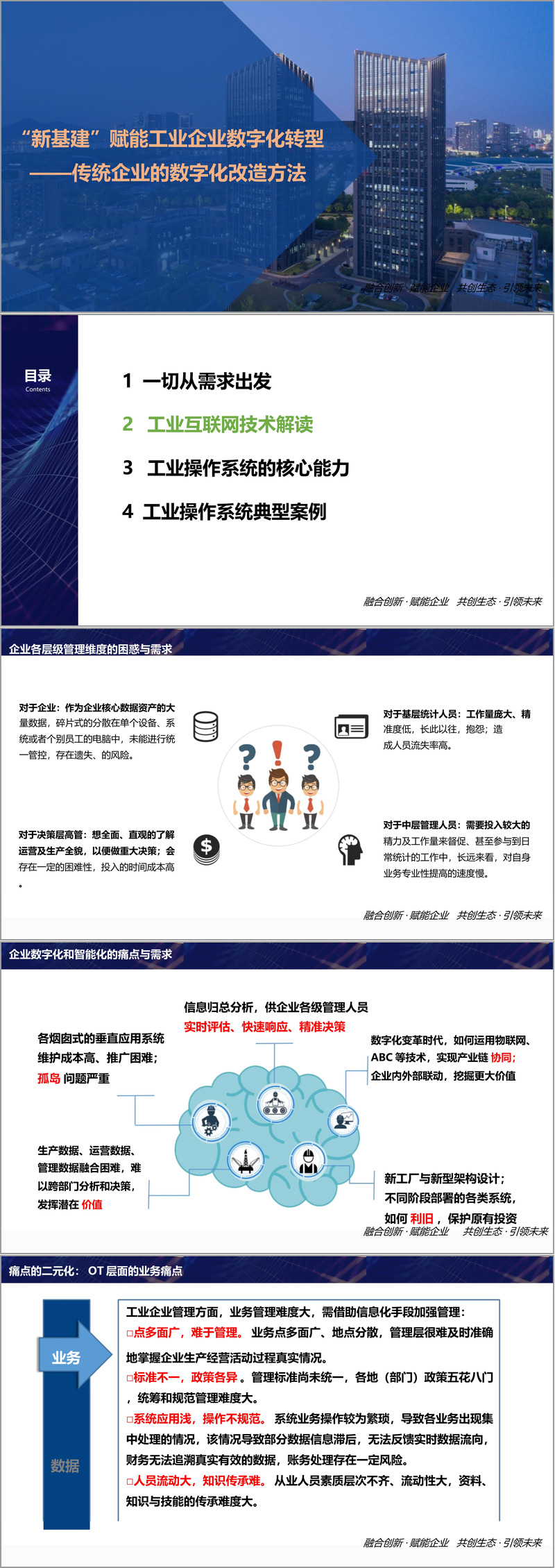 在数字化浪潮席卷全球的当下,工业企业数字化转型已成为必然趋势。这份方案围绕 "新基建" 赋能工业企业数字化转型,聚焦传统企业的数字化改造方法,以 "融合创新・赋能企业,共创生态・引领未来" 为核心理念,从需求、技术、核心能力和典型案例四大维度展开全面阐述。