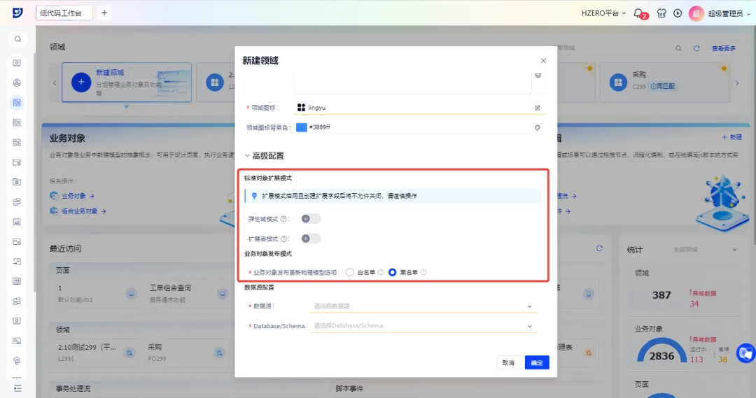 - 开启扩展模式:在平台级领域管理中,选择弹性域模式或扩展表模式开启扩展能力