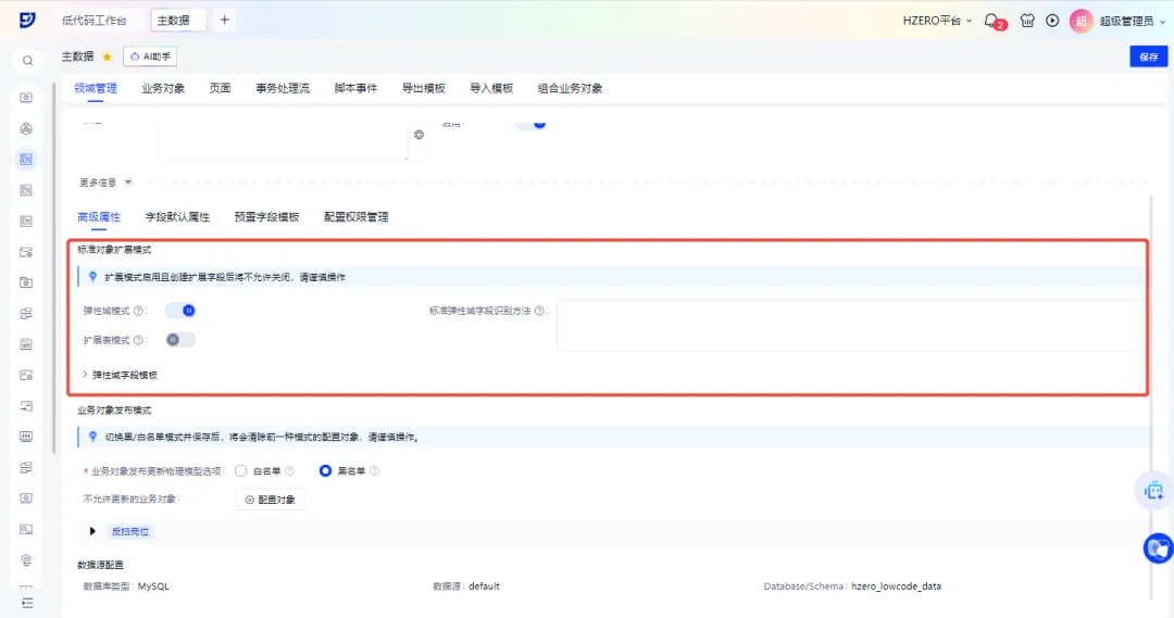 标准对象扩展模式是领域级的高级属性,仅支持在平台级开启 。