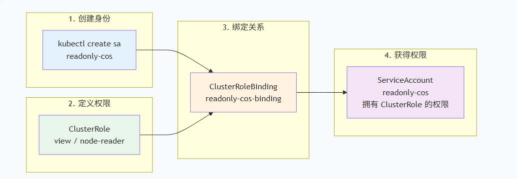 ServiceAccount、ClusterRole、clusterRolebinding关系图如下: