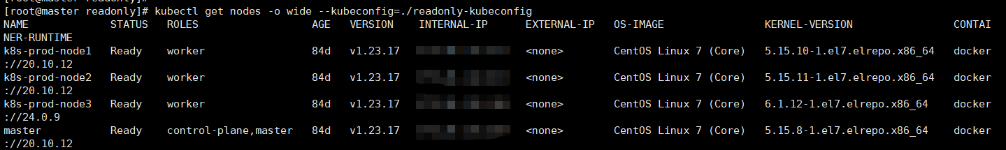 [root@master readonly]# kubectl --kubeconfig=/zq/readonly/readonly-kubeconfig get nodes