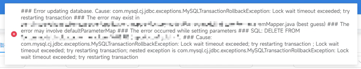 这是一个 MySQL 锁等待超时(Lock Wait Timeout) 错误,意思是当前事务尝试更新某行数据,但这行数据已被其他事务锁定,等待超过阈值后报错。