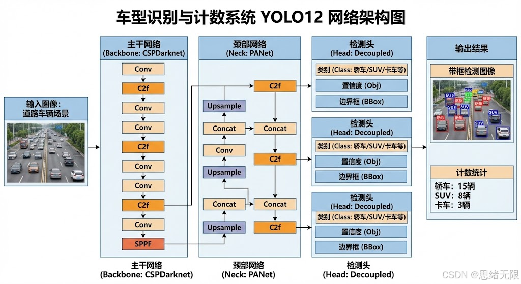 本系统的核心目标是把"车型识别"与"计数"统一为可工程复现的一条推理链路:前端输入(图片/视频/摄像头)经由检测模型输出车辆边界框与车型类别,再将检测结果交给计数逻辑(跨帧关联与规则触发)完成总量与分车型统计。考虑到部署侧对实时性与可维护性的共同要求,老思在模型侧采用"默认主模型 + 多版本可切换"的设计:默认使用 YOLOv12n 作为主检测器,同时保留 YOLOv5--YOLOv11 的权重导入接口,确保在相同数据与相同 UI 交互下可以做跨代对比。YOLO 系列在结构层面通常采用 Backbone--Neck--Head 的三段式范式,YOLOv5 的官方结构示意(包含 CSPDarknet53 主干、SPPF 与 PANet 融合、检测头输出)可作为该范式的典型代表。(Ultralytics Docs)