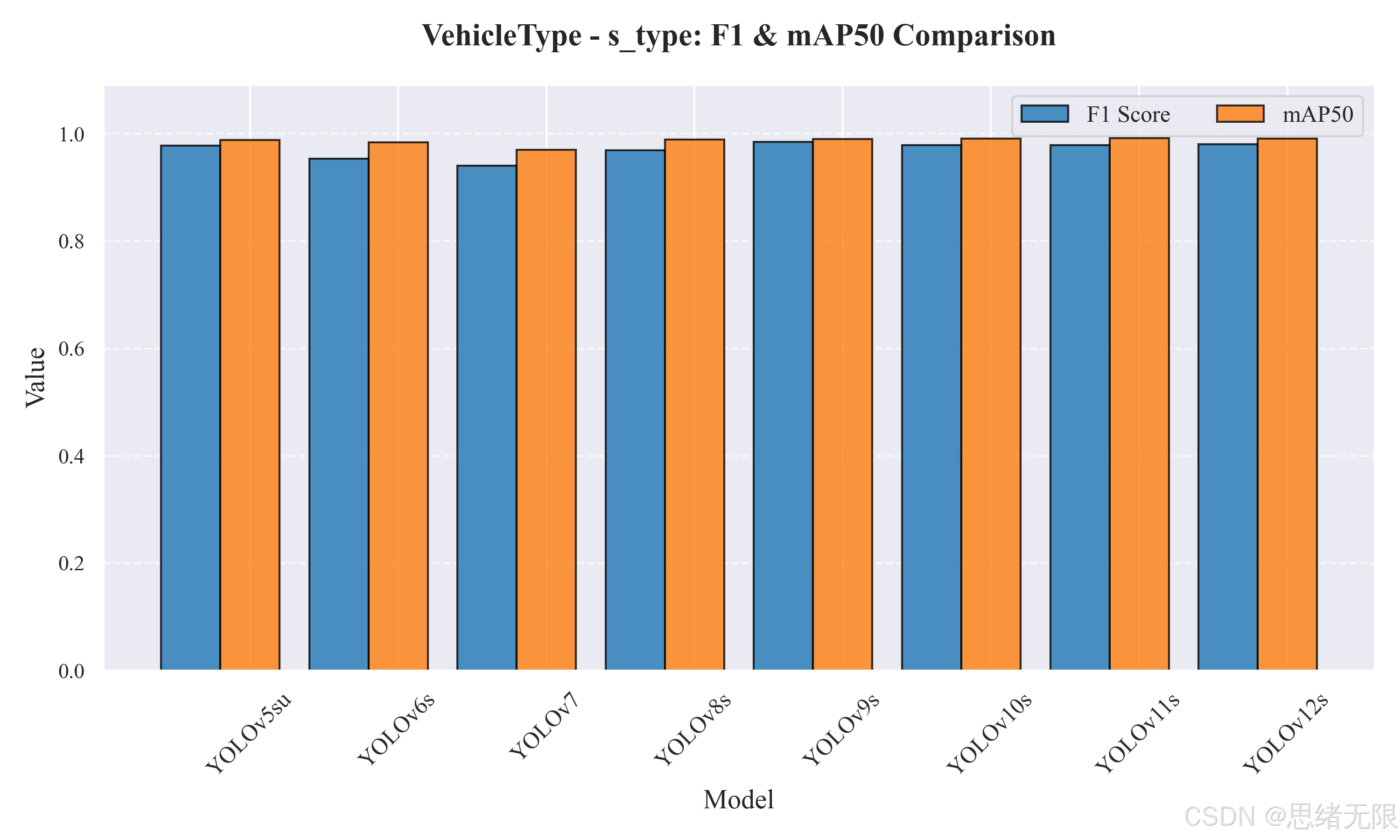 s 量级结果:柱状图中 YOLOv9s 的 F1 最突出,说明其在当前数据分布上实现了更高的精确率与召回率同步提升;而在更严格的 mAP@0.5:0.95 上,YOLOv10s 最优(表5-2),往往意味着其回归框在不同 IoU 阈值下更鲁棒,这对于计数任务中"框抖动引发的轨迹断裂"具有潜在抑制作用。值得注意的是,YOLOv8s 在推理延迟上最具优势(7.66ms),而 YOLOv11s 在 mAP@0.5 上达到最高值(0.9917)且延迟相对可控(9.74ms),因此若系统目标是桌面端实时展示与计数闭环的稳定运行,YOLOv8s/YOLOv11s 往往会成为更均衡的默认候选;相对地,YOLOv7(大模型)在本任务上既慢且精度不占优,说明"参数堆叠"并不会自动转化为细粒度车型的收益,尤其在数据规模与分布较有限时更是如此。