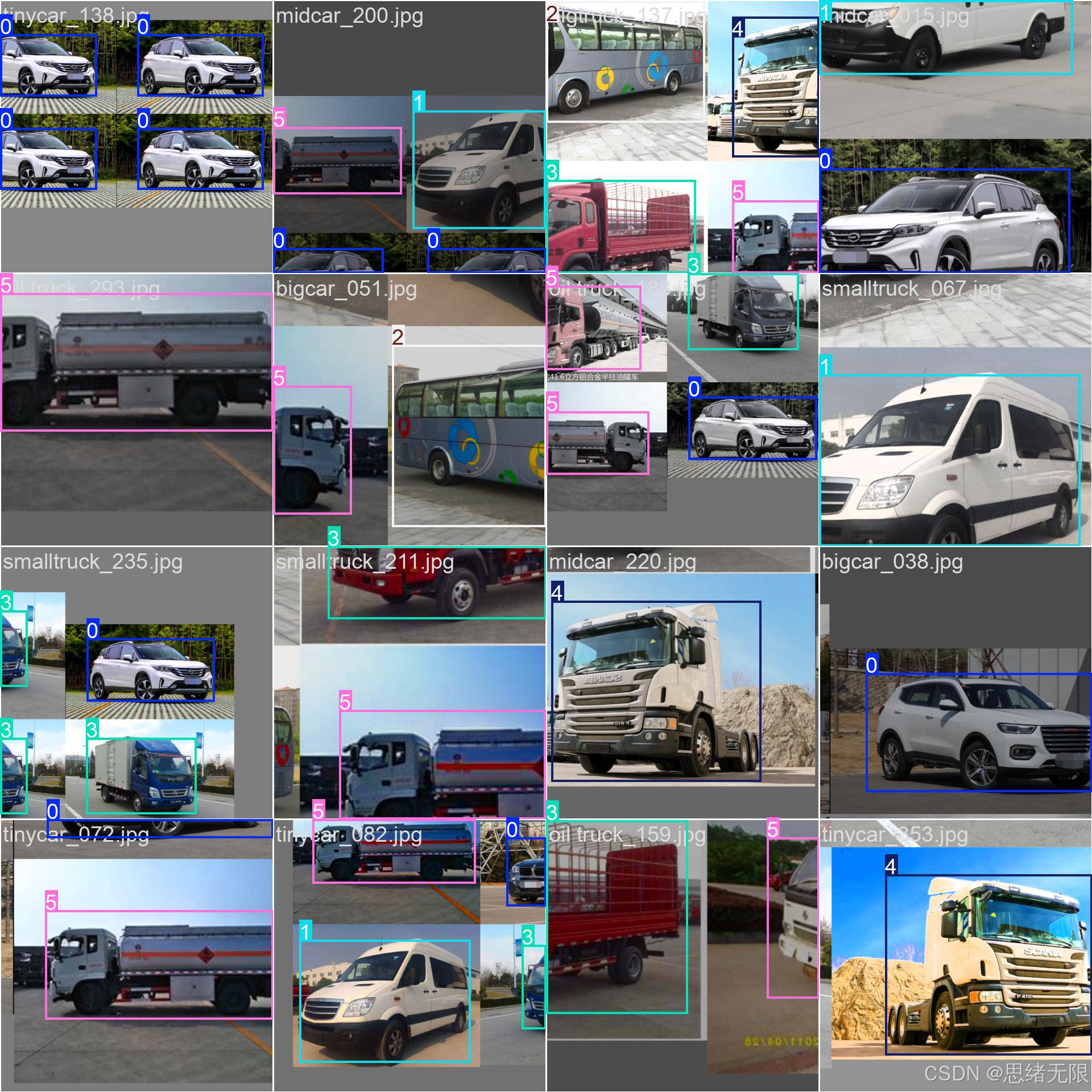 本项目面向道路场景的车型识别与计数任务构建了一个 7 类目标检测数据集,共 2,026 张图像,并按训练/验证/测试划分为 1,488/507/31 张(约 73.45%/25.02%/1.53%)。类别体系覆盖小型车、中型车、大型车以及多种典型货运与特种车辆,分别对应 tiny-car(小型车)、mid-car(中型车)、big-car(大型车)、small-truck(小型卡车)、big-truck(大型卡车)、oil-truck(油罐车)、special-car(特种车)。从训练批次可视化可以观察到,该数据集在视角、背景与光照上具有一定多样性,但目标通常占据画面主体区域,属于"车辆主体裁剪/近景"为主的分布,这一特征有利于车型细粒度判别,却也意味着在迁移到远距小目标的监控视角时,需要通过尺度扰动与仿射增强来弥补域差异。