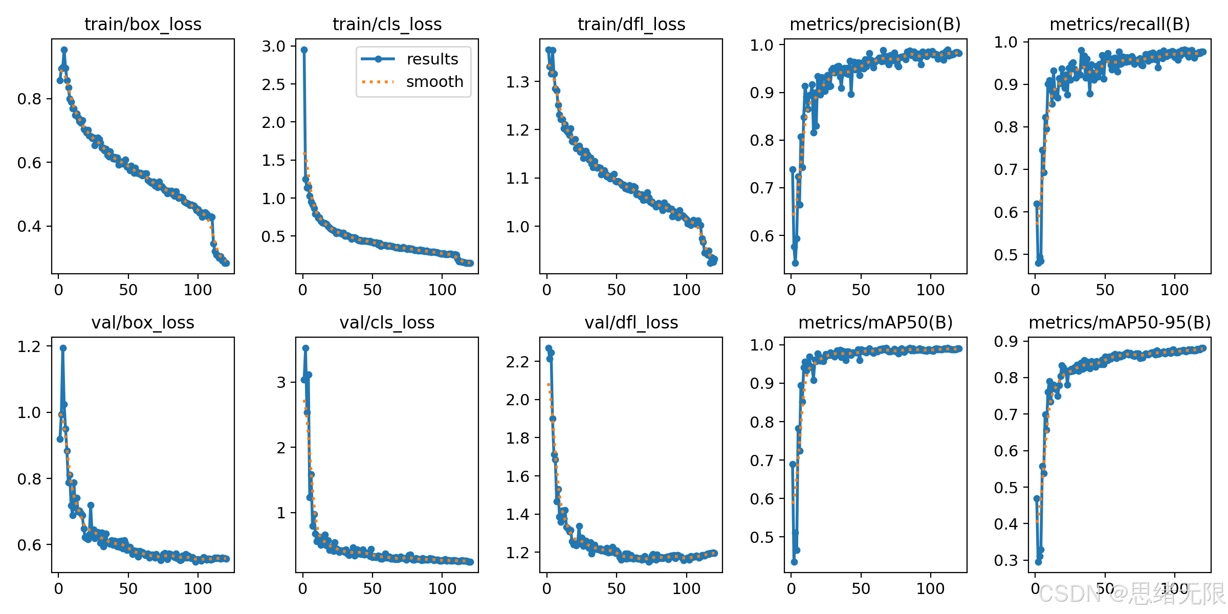 其中 θ \theta θ 为当前网络参数, α \alpha α 为衰减系数。训练过程采用早停(patience)与"以 Val mAP50--95 选择 best 权重"的策略,既避免无效迭代,也为跨版本对比提供统一的模型选取标准。